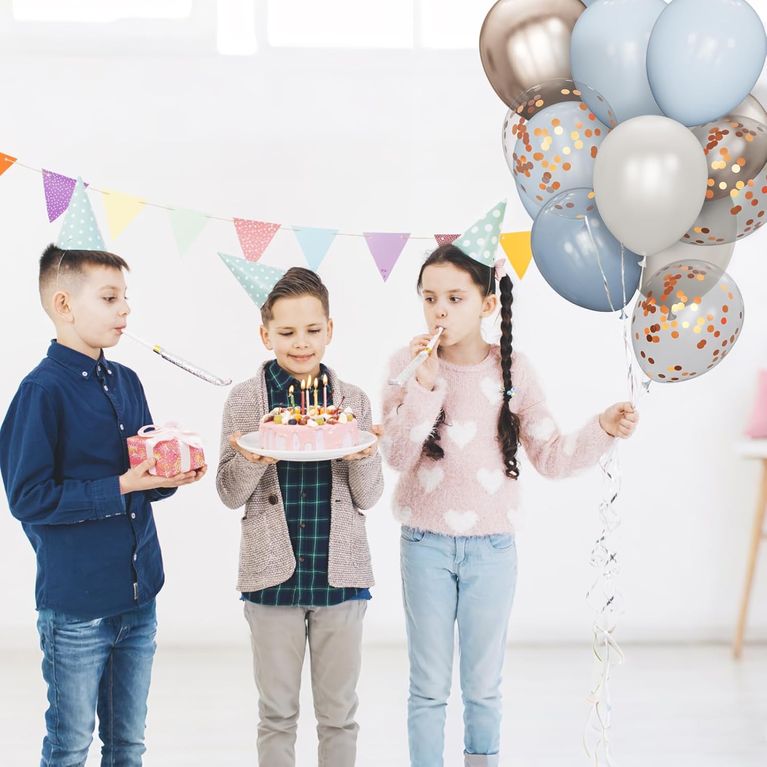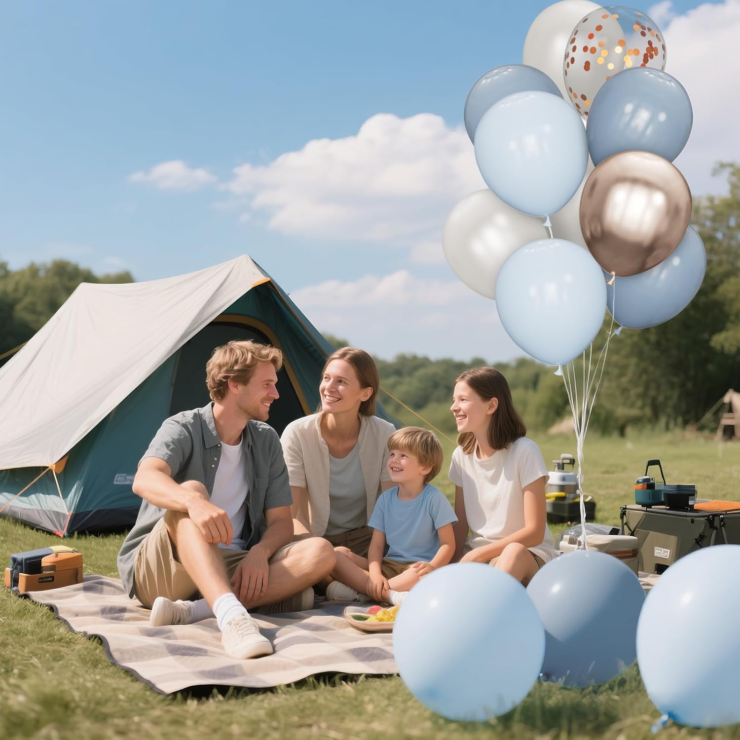 - Simple balloon pack: Contains 68 pieces of 12-inch latex balloons, including 15 metallic Champagne Gold balloons, 8 Champagne confetti balloons, 15 white sand balloons, 15 baby blue balloons, 15 Dusty Blue Balloons latex balloons, and 2 ribbons.