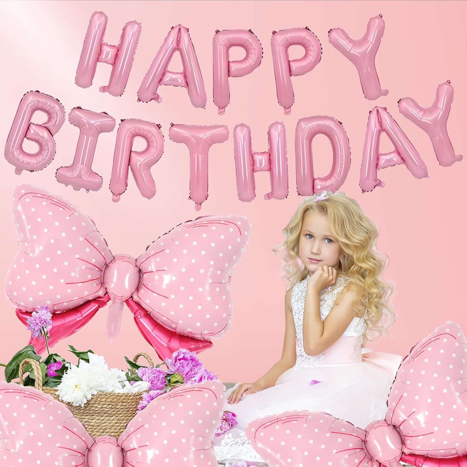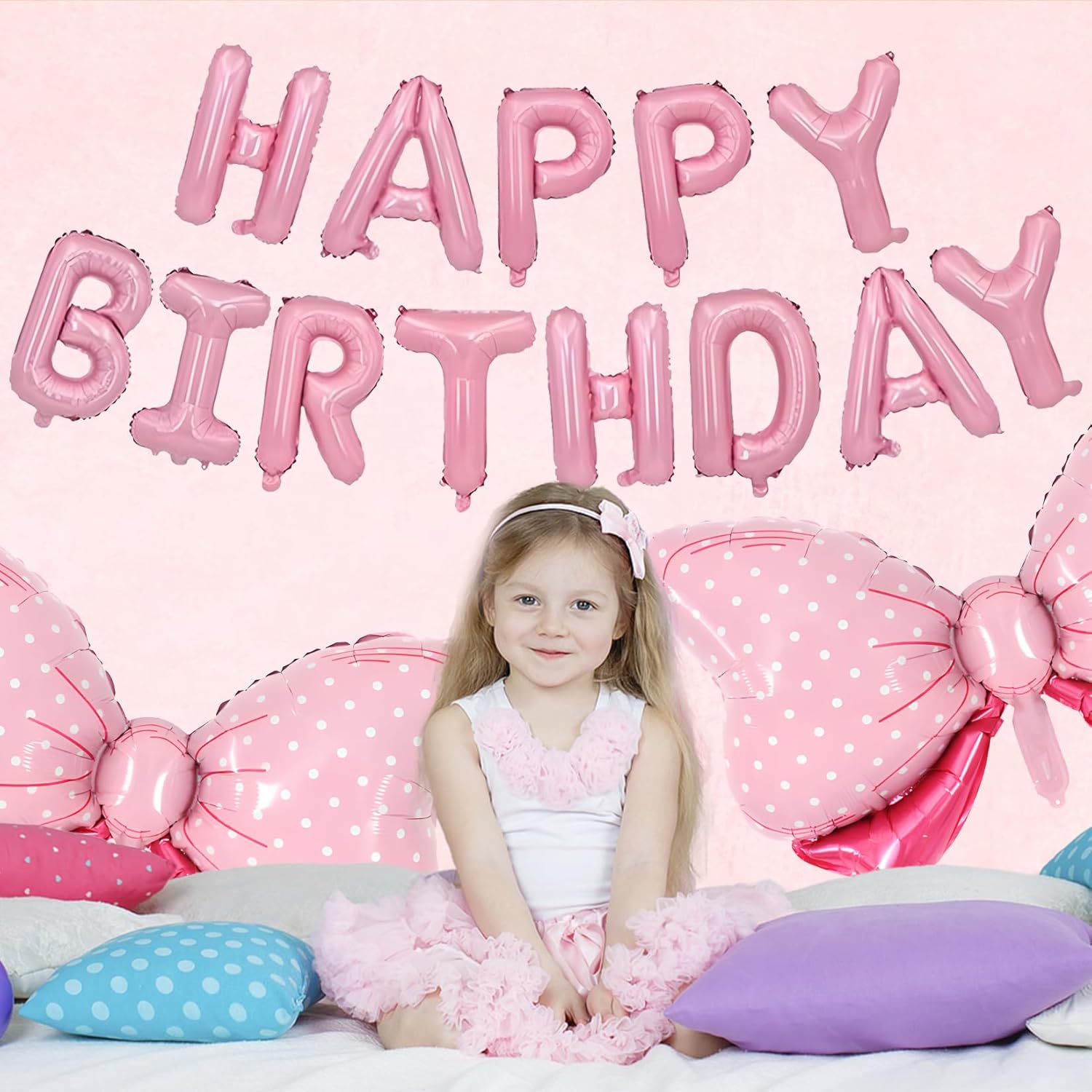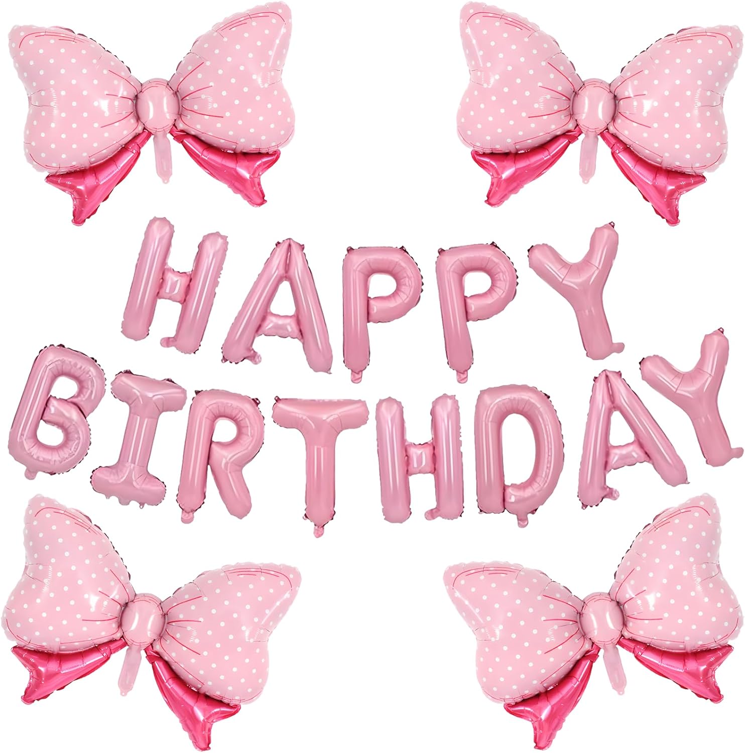 - Pink Happy Birthday Balloon Banner, 16 inch "HAPPY BIRTHDAY" letter balloons and paired with 4pcs 36 inches bow balloon, is a very novel idea.It will add some creativity to the decoration of your child's birthday party.Pink bow birthday decorations for girls are made of high-quality polyester film and aluminum foil materials, easy to inflate, and with self-sealing valves. Non-toxic and touch-safe, easy to hang and carry, durable, and easy to store for a long time.