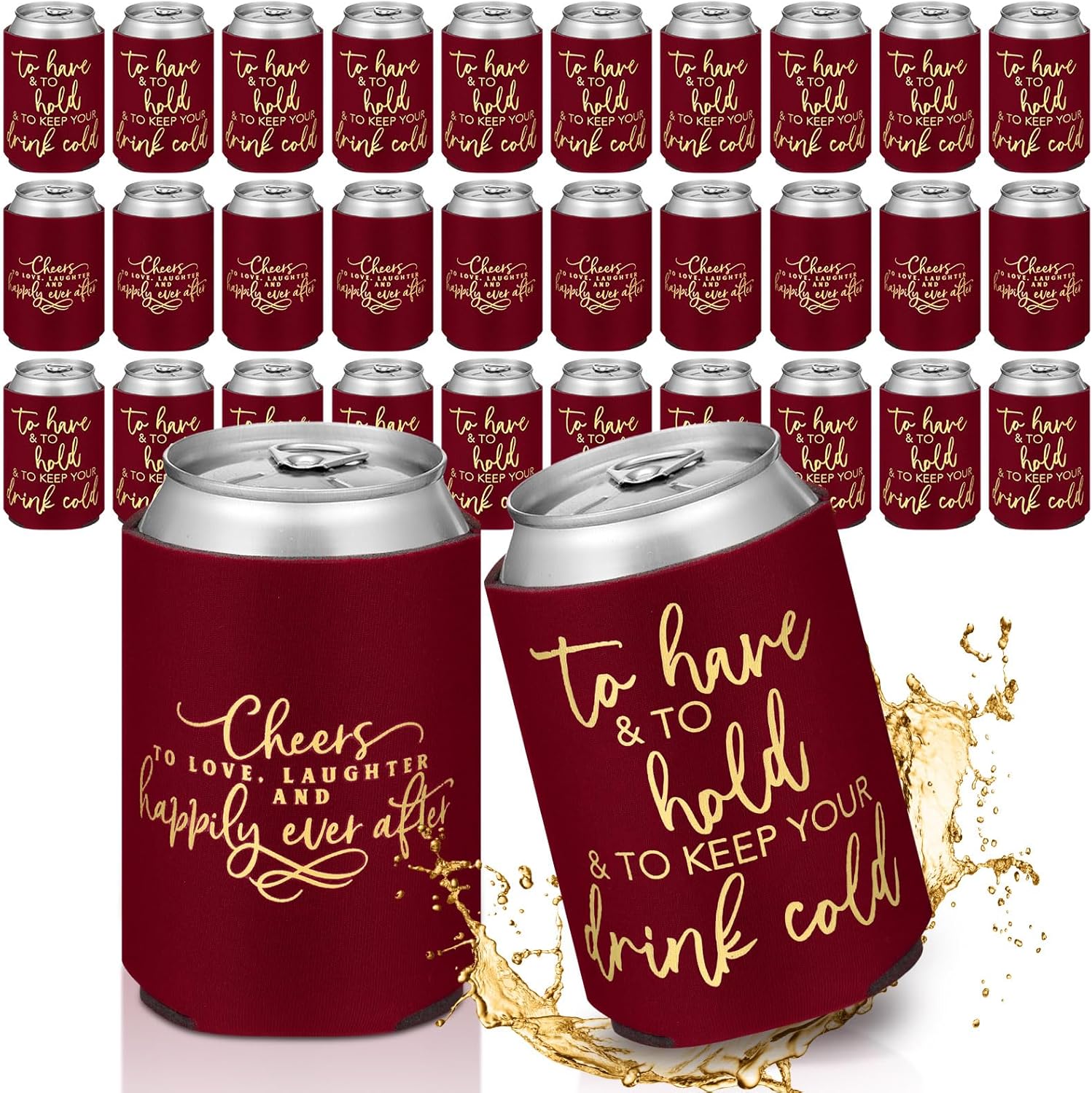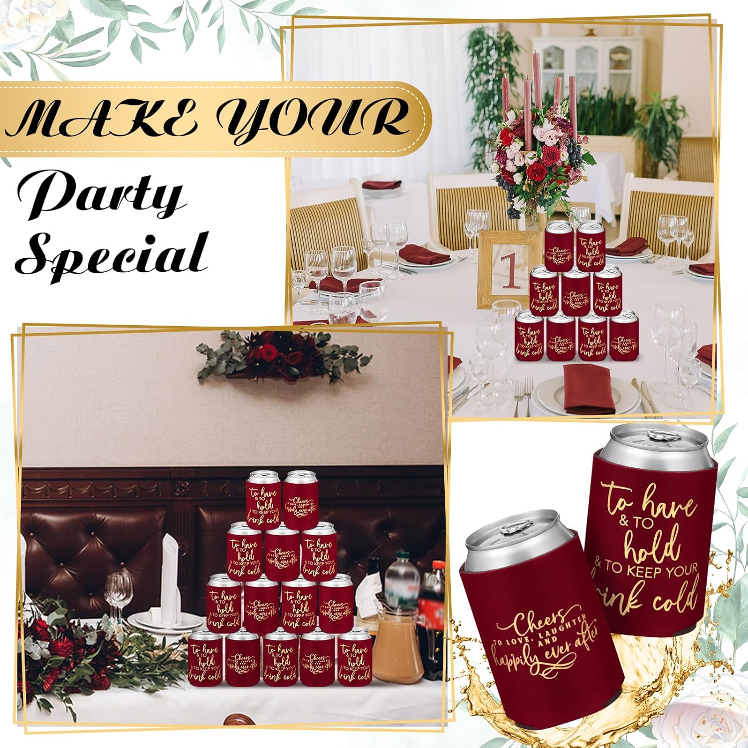 - Satisfying Party Package: our huge package containing 50 pieces of wedding can cooler decorations; Make every drink a celebration with our wine red and gold can coolers; They are suited to uplift the atmosphere at weddings, bridal showers, and bachelorette parties