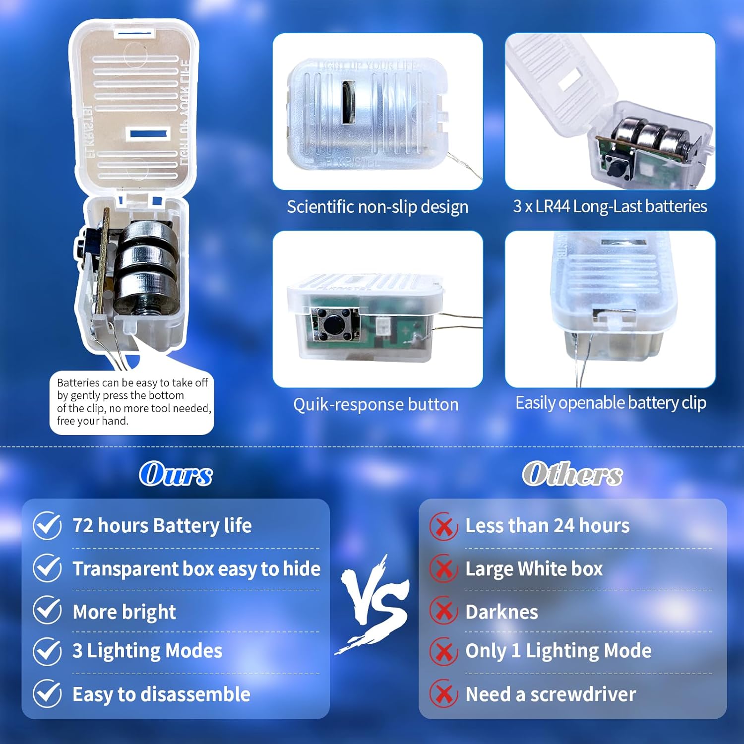 - PREMIUM QUALITY AND LONG LAST LIFE: 100 pack in a box, each twinkle lights made of high quality durable 7 feet long flexible silver wire, and 20 energy-efficient mini led fairy lights, 4 inch distance between each led moon lights. This fairy lights battery operated by 3 x LR44 batteries (included), which can provide 101 hours life. This Christmas lights is perfect for both everyday decorations as well as holiday decor (Batteries need to be replaced when the string get dims)