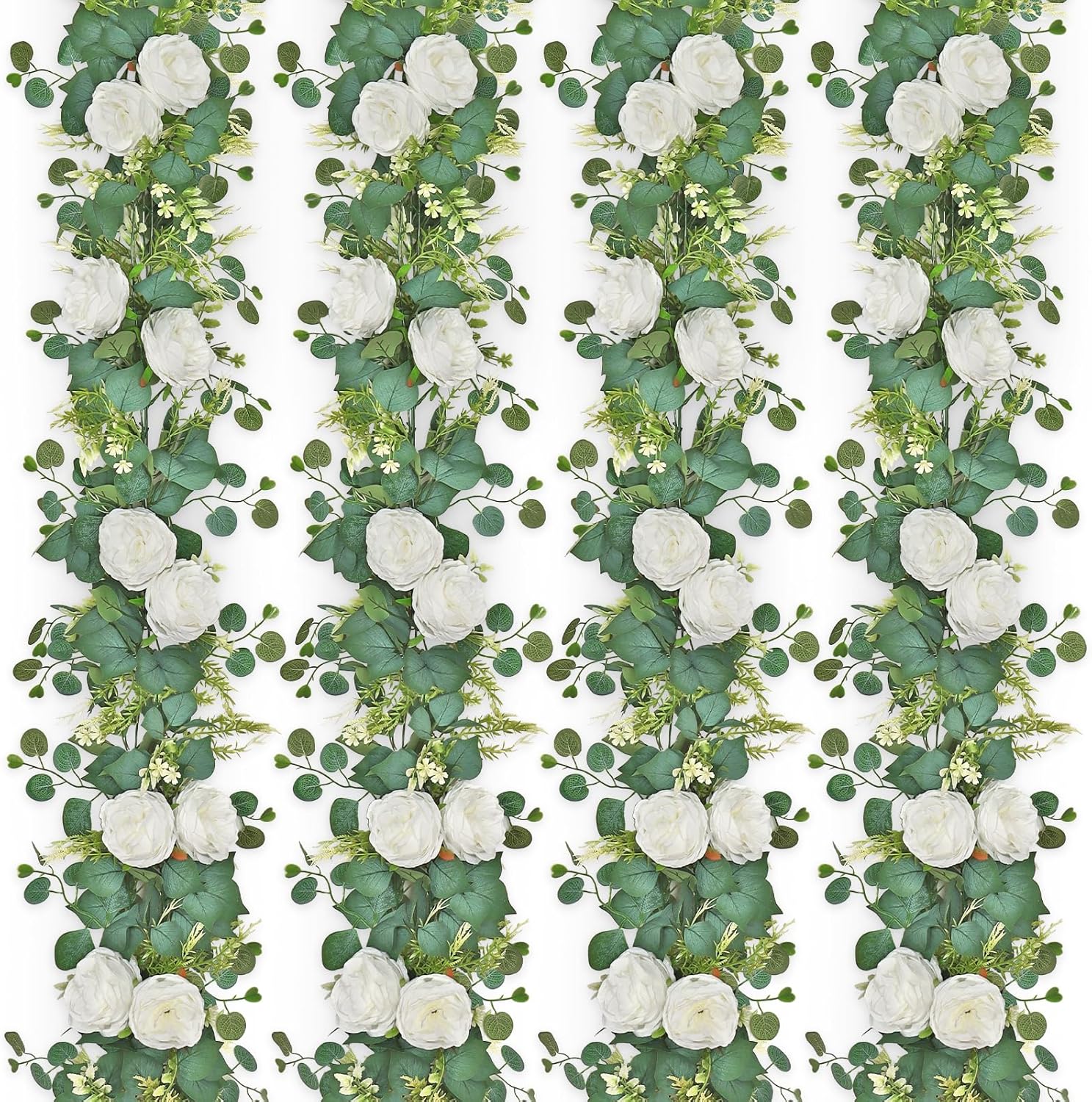 - Package Included: The package includes 4PCS artificial eucalyptus garland with peony flowers. Each piece of flower vine is 6.23Ft/1.9M long and decorated with 7 white peony, some little white flowers and eucalyptus leaves. It is Easy to trim or bend the shape to your liking and decorating needs.