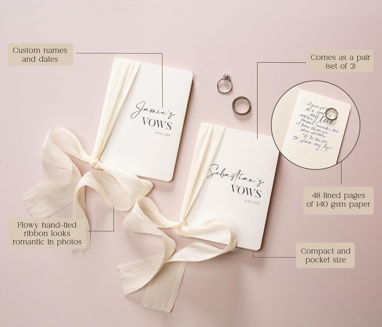 - Each vow book in our set measures 5.625 x 4 x .5 inches, making them pocket-sized for easy carrying. Crafted from high-quality materials, these softcover vow books offer durability with a sophisticated finish. The flowy ivory ribbon adds a touch of romance and softness against the texture of the book.