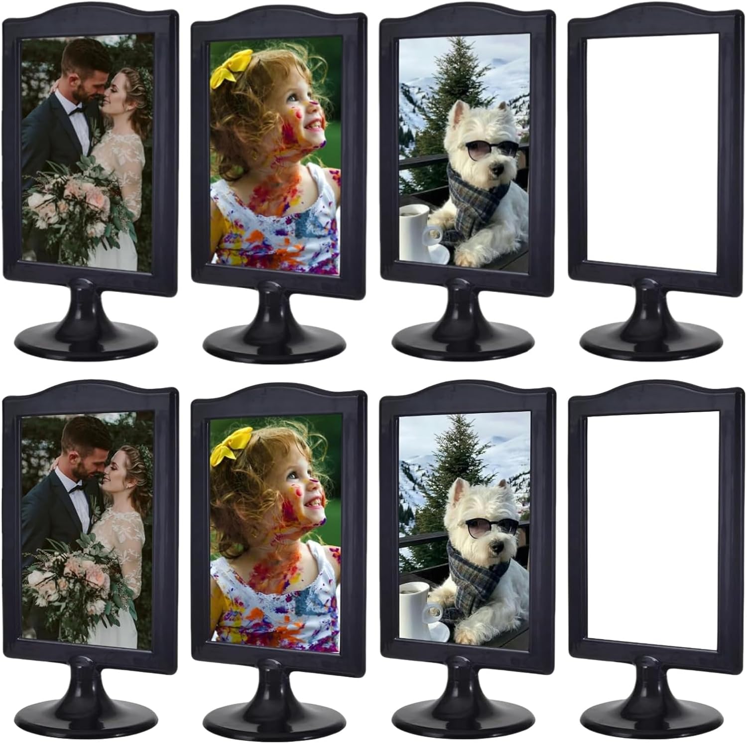 NahNah Double Sided Standing Picture Frames - (Black, 8 Count) 4x6 Inch, Plastic Pedestal Photo Frame with Inserts and Base - 2 Sided Tabletop Vertical Display Frame for Wedding Table Bridal