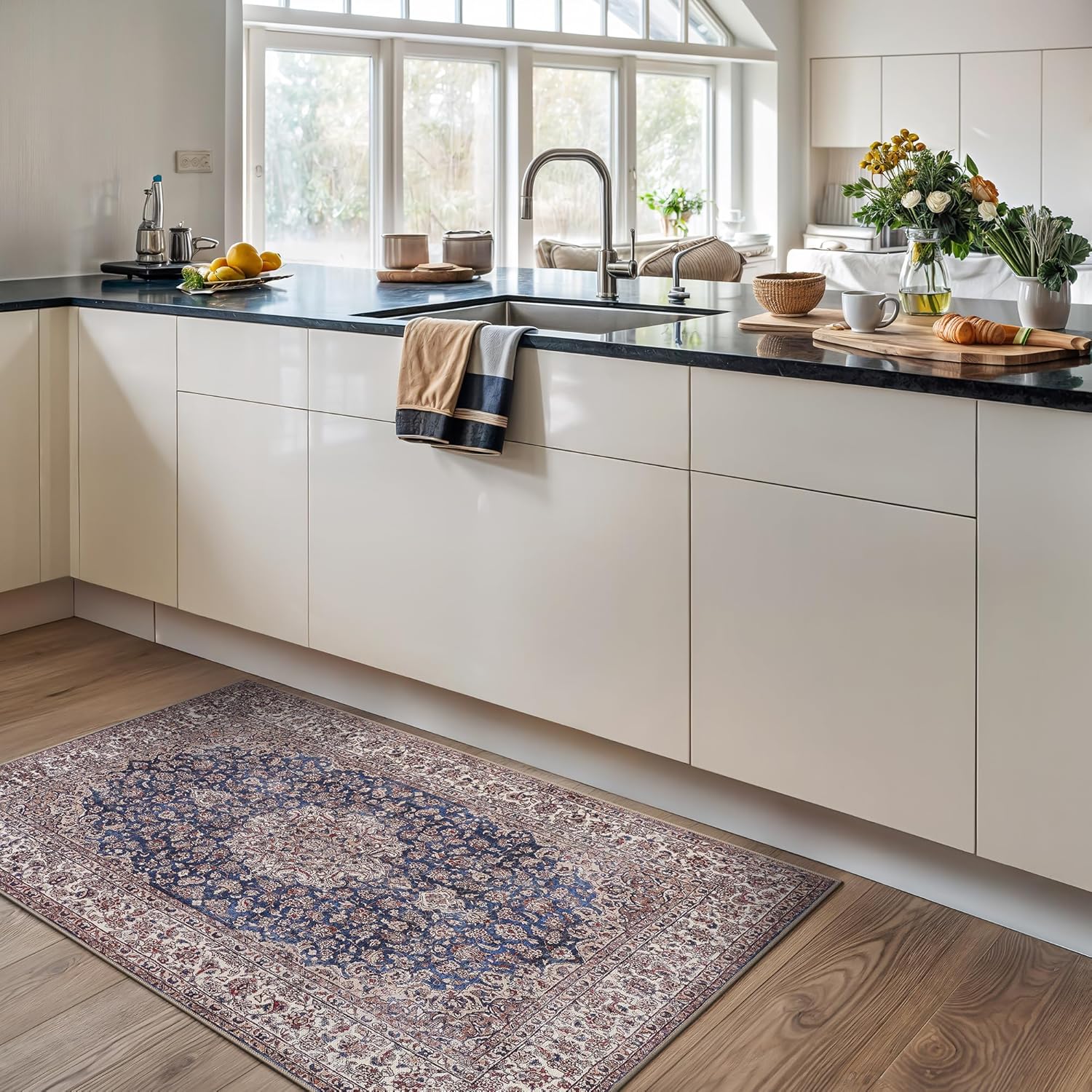 Bloom Rugs Washable Non-Slip 3' x 5' Rug - Dark Blue/Beige Traditional Medallion Area Rug for Living Room, Bedroom, Dining Room, and Kitchen - Exact Size: 3' x 5'