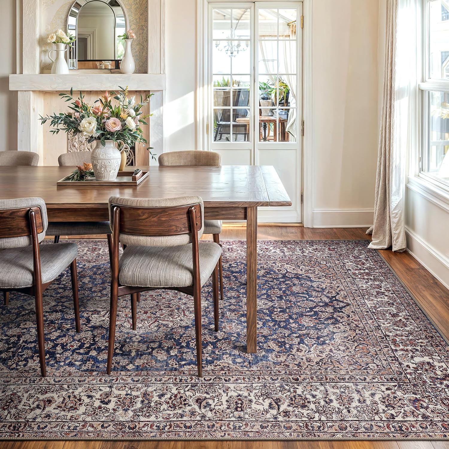 Bloom Rugs Washable Non-Slip 9' x 12' Rug - Dark Blue/Beige Traditional Medallion Area Rug for Living Room, Bedroom, Dining Room, and Kitchen - Exact Size: 9' x 12'