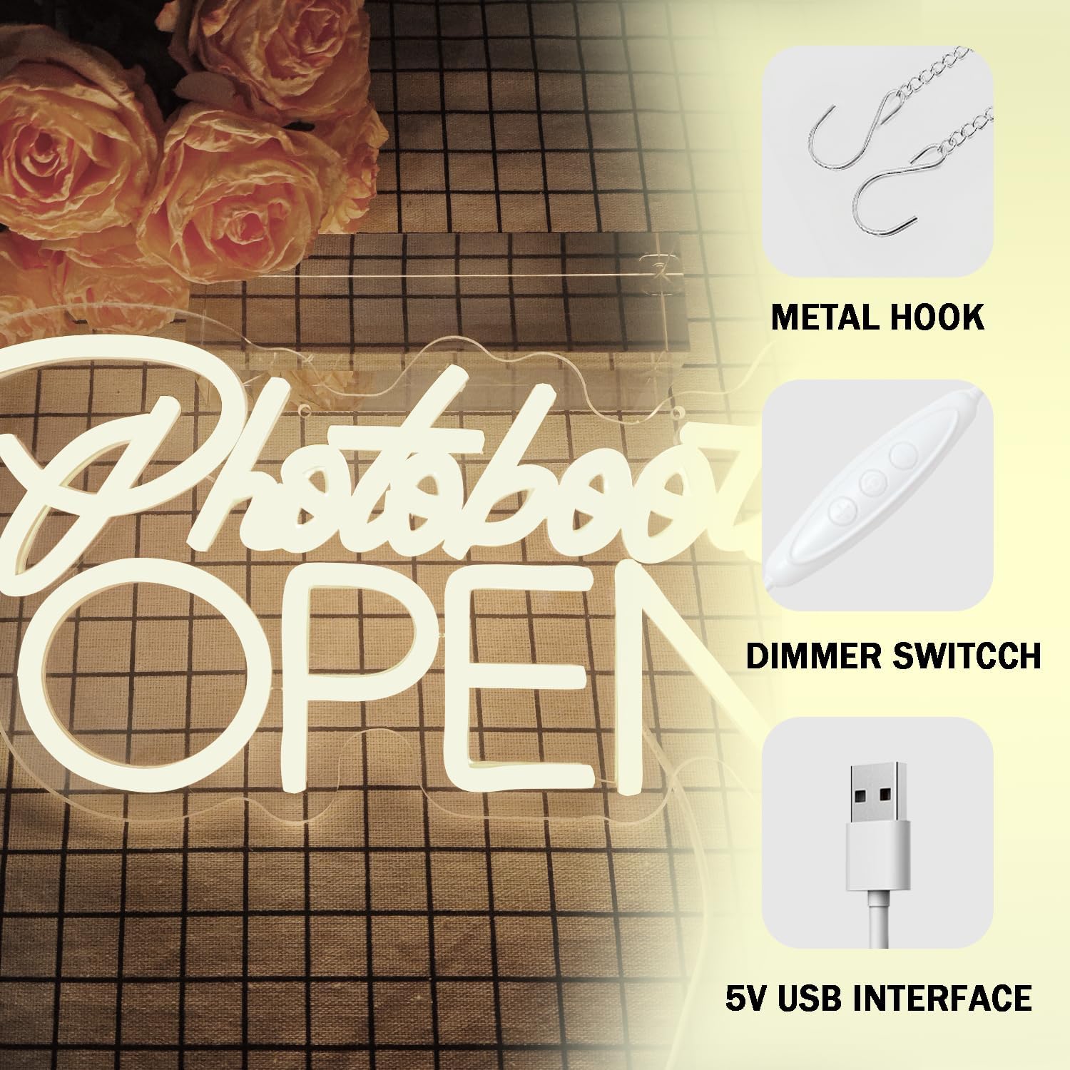 PhotoBooth Neon Sign for Wall Decor Dimmable Photobooth Neon light with USB Open Neon Light Office Open Sign Neon Decor Wedding Reception Sign