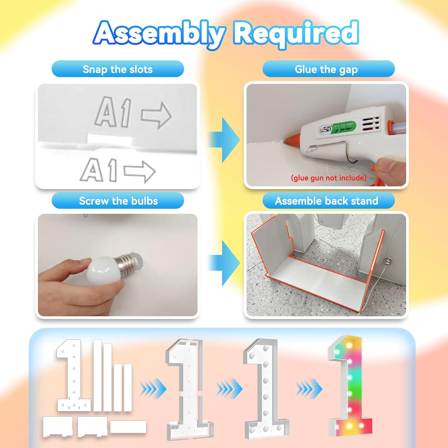 - 【Assembly Required】 4FT Marquee numbers are composed of pre-cut foam plates, and also include a remote control, bulbs, and corresponding LED light strings. The product comes with detailed installation instructions and video installation tutorials, making it easy for one person to assemble. When these large light up numbers and numbers come on, your party can achieve amazing decorative effects.