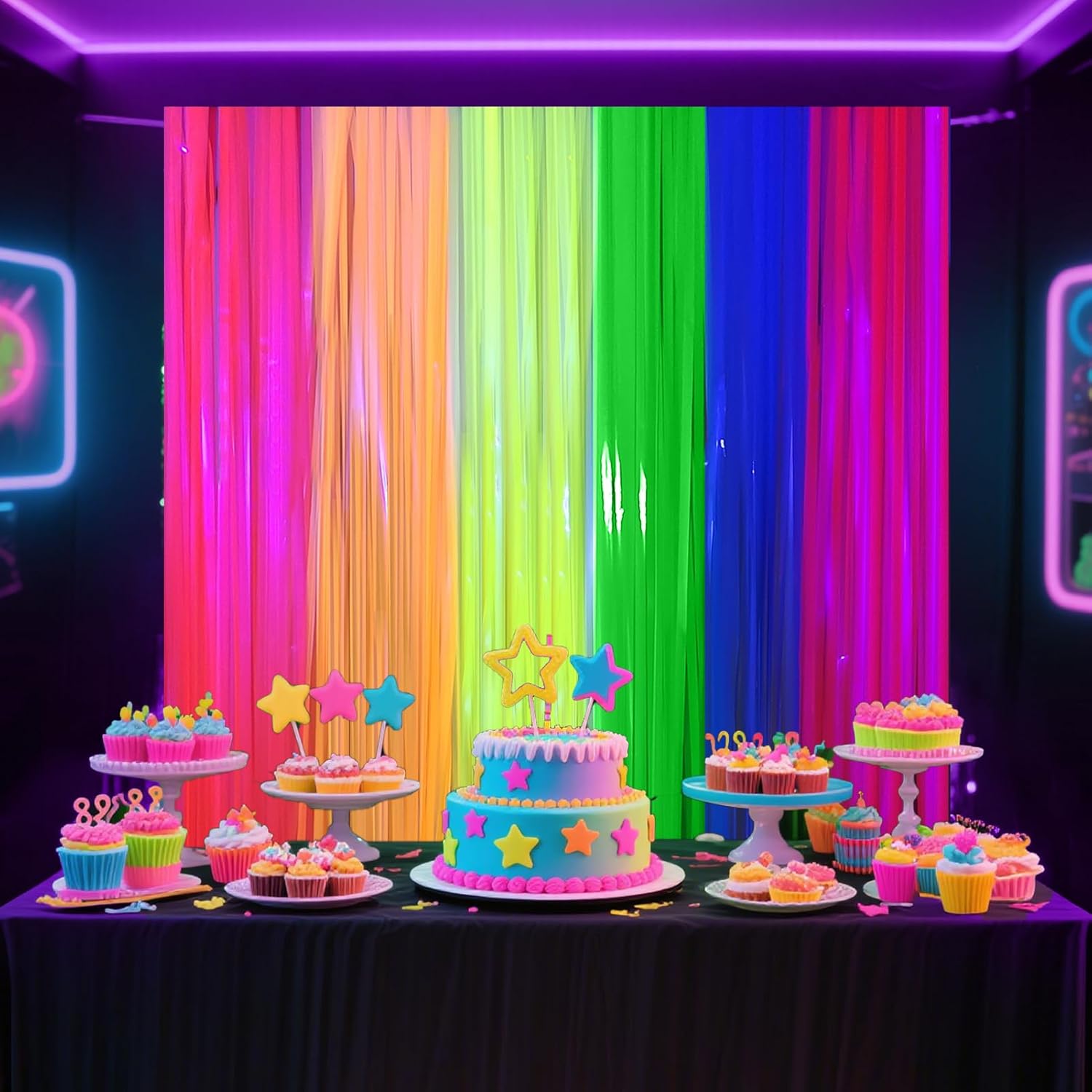 - Glow in the Dark Party Supplies: You will get 4 pcs fluorescent macaron rainbow tinsel backdrop, size: 6.6ft*3.3ft. The foil fringe curtains are perfect for blacklight dark glow party decorations, on the door or wall to create an impressive decoration for parties, events, and photo booths.