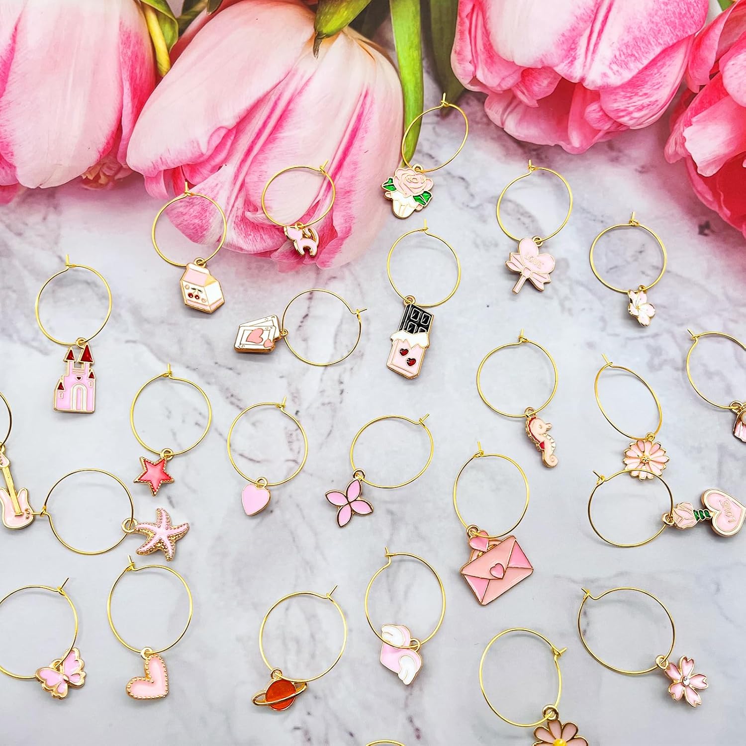 - Unique Design: Our wine glass markers are mainly pink in color, with 30 very cute and interesting wine charms for stem glasses. Eachwine markers for glasses is unique, including shells, starfish, unicorns, guitars, seahorses, music symbols, bows, hearts, roses, chocolates, playing cards, castles, and magic wands. Wine party decorations in different shapes can not only easily attract others' attention, but also decorate your wine glass well