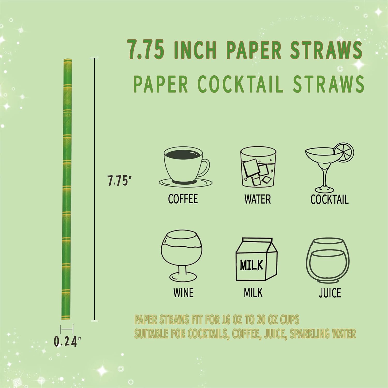 GLUJASBIO 7.75" Green Disposable Paper Straws - Biodegradable Drinking Straws for Party Suppliers, Cocktails, Juices, Drink, 100 Pack, Bamboo Pattern