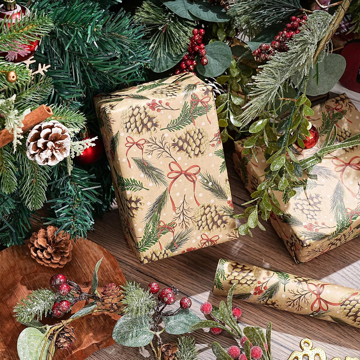 RUSPEPA Kraft Christmas Wrapping Paper Roll, Mini Roll, Pinecone and Greenery Design with Red Bow and Snowflake, Kraft Gift Wrap Paper for Christmas, Holiday, Winter Party, 17 Inches x 16.4 Feet