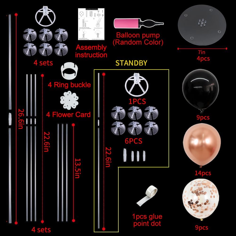 - Package Includes: The balloon arch kit includes 4 reusable balloon centerpiece table decorations and 12inch 32 pcs Latex Balloons (14 rose gold balloons,9 black balloons,9 rose gold confetti balloons),glue point dots,balloon pump,balloon clips,and tie tool.You don’t need to waste money to buy balloons