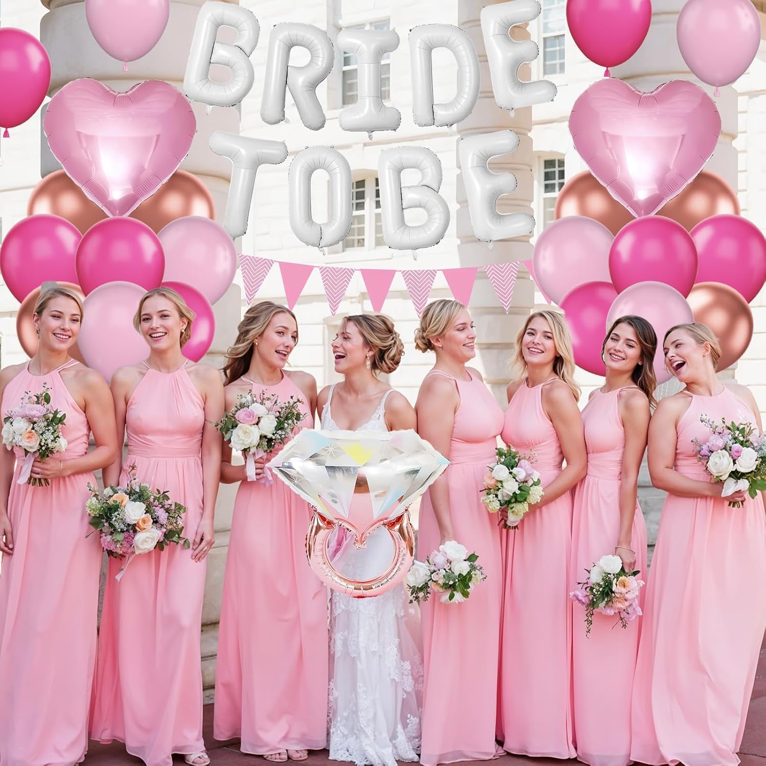 - Bachelorette Party Decorations: The rose gold and pink bachelorette party decorations includes white "BRIDE TO BE" letters balloons, pink foil heart balloons x 2, 12inch latex balloons (baby pink x 5, hot pink x 5, metallic rose gold x 5), diamond ring balloon x 1, pink banner x 1, glue point x 20, balloon ribbon x 1. Pink white and rose gold wedding decorations can be used as background decorations for the bride and friends and family.