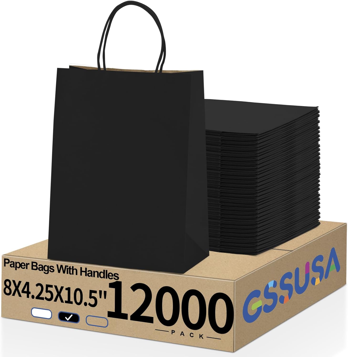 GSSUSA 12000 Pack 8x4.25x10 Inch Paper Bags with Handles Bulk, Black Paper Gift Bags for Small Business, Heavy Duty Bulk, for Birthday Party Favors, Shopping, Retail