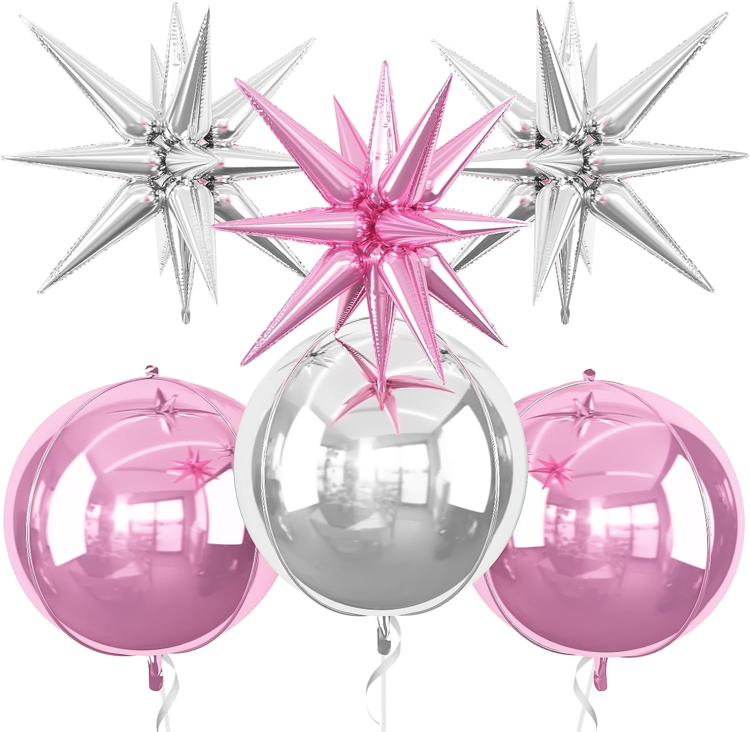 6Pcs Pink Silver Foil Balloons,22Inch Light Pink Silver 4D Round Ball Balloon and Explosion Star Balloon for Birthday Wedding Baby Shower Anniversary Decorations