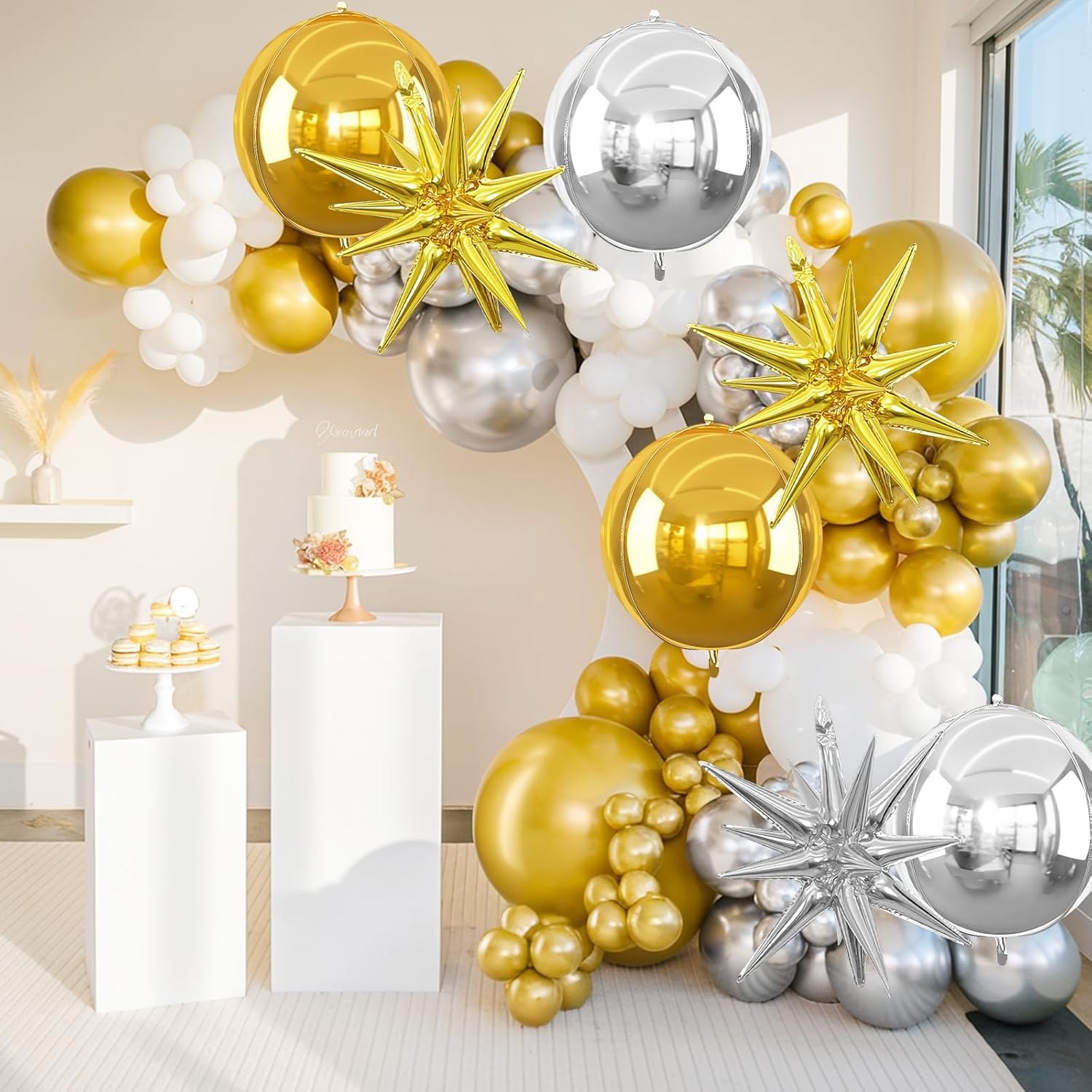 6Pcs Gold Silver Foil Balloons,22Inch Silver Gold 4D Round Ball Balloon and Explosion Star Balloon for Birthday Wedding Baby Shower Prom Party Anniversary Decorations