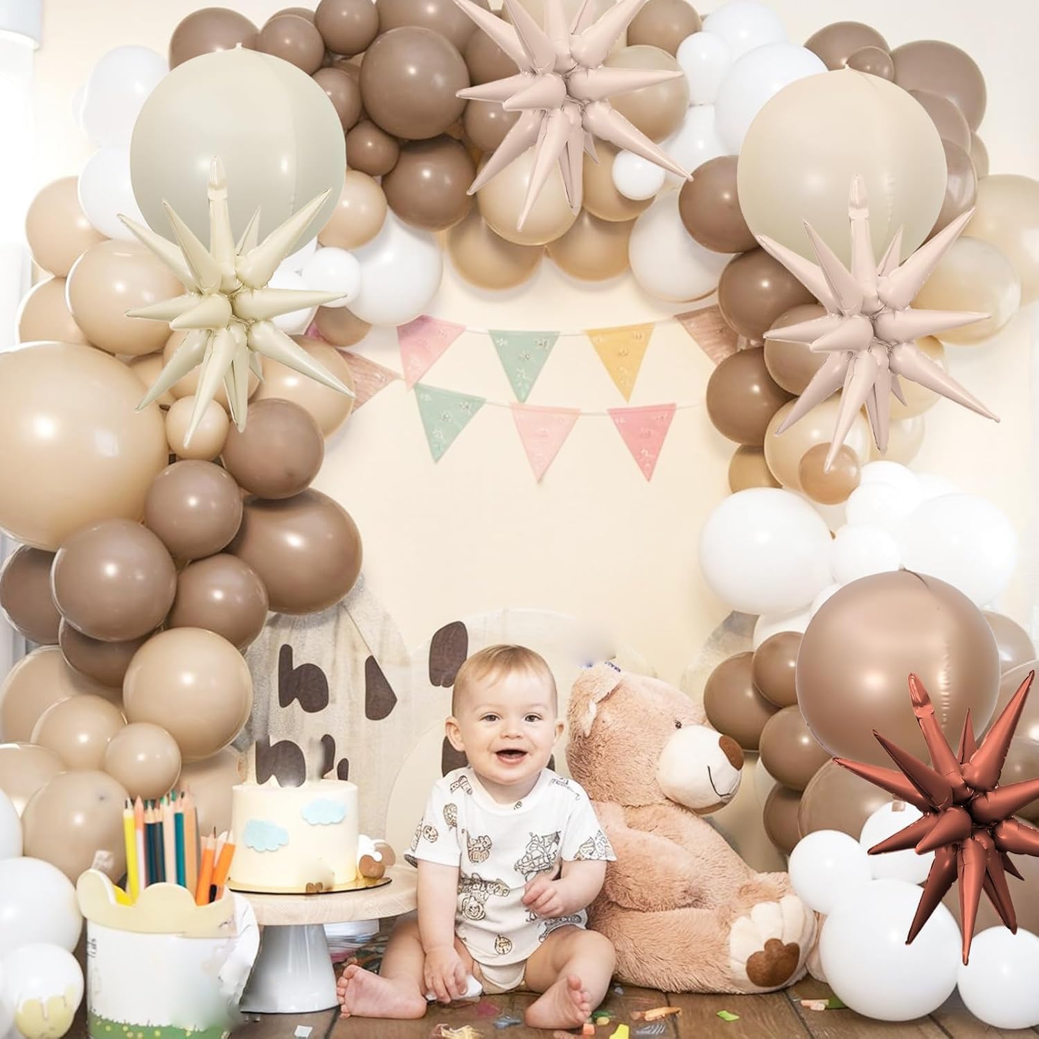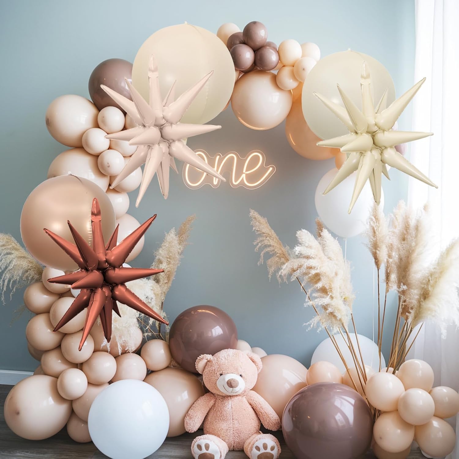 - 【Note】Due to issues with the sand white brown party decoration version, there may be some color differences in the balloons. Please refer to the received item. Explosion star balloons cannot use helium gas. In addition, please do not excessively inflate aluminum film balloons or rub them with sharp objects to avoid explosions,inflate to 85% done.