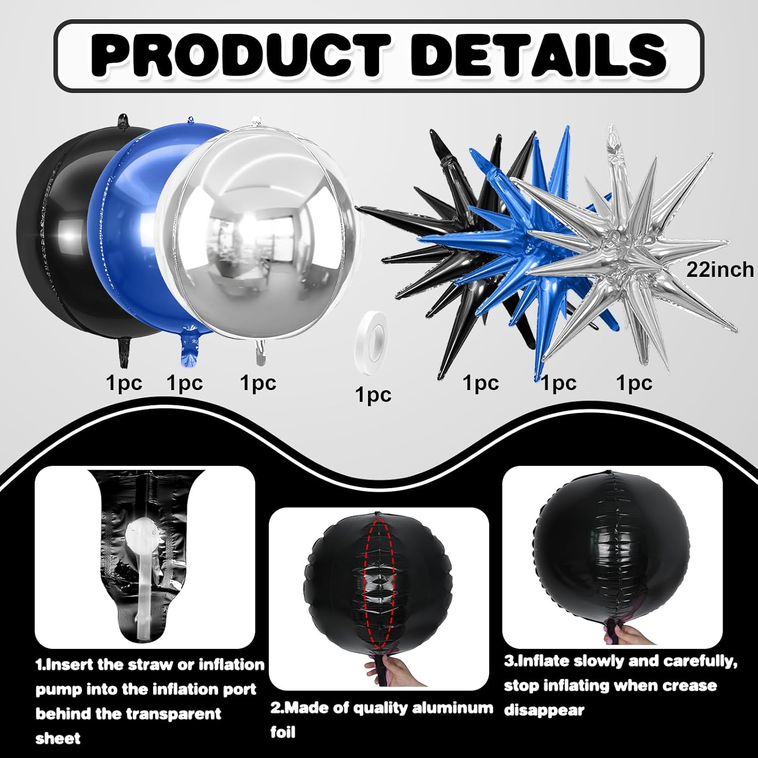 - 【Easy Use】Our blue black silver foil balloons are easy to inflate. The straw inside the package can help you inflate the balloon. After inflation, you can pinch your fingers to the position of the inflation to automatically seal it.