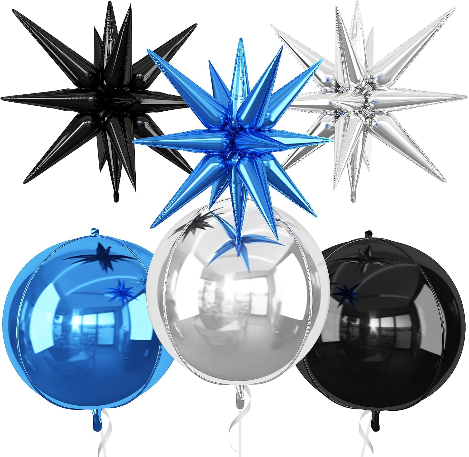 - 【Package】The package includes 3pcs 22Inch 4D ball foil balloons(black x 1,blue x 1,silver x 1),3pcs 22Inch star foil balloons(black x 1,blue x 1,silver x 1),and ribbon.These huge balloons can help you decorate your party better.