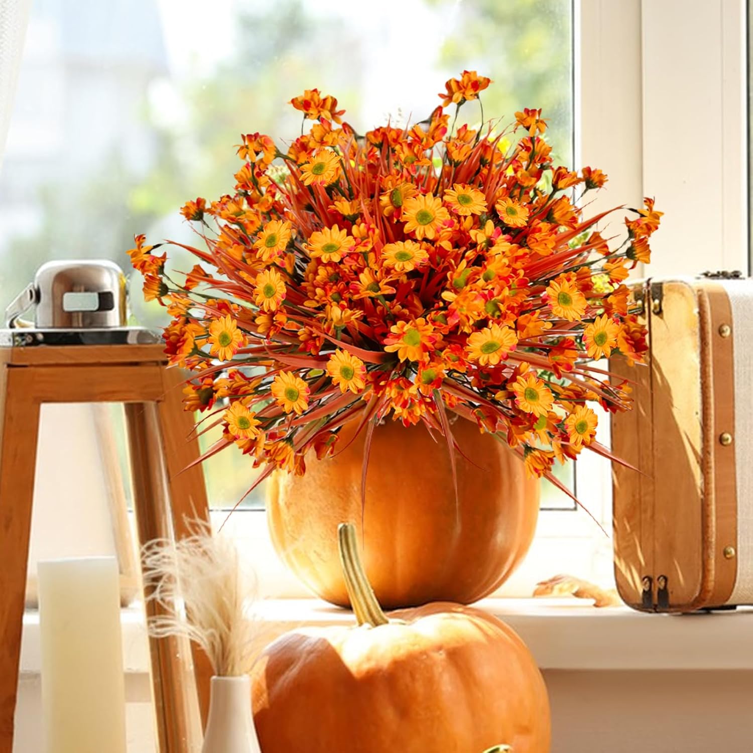 - Fall Outdoor Decor :Includes 12 bundles of artificial flowers,each bundle is full with bright petals and just enough greenery to give a balanced, natural feel. Perfect for filling a window basket to make a nice fall arrangement.