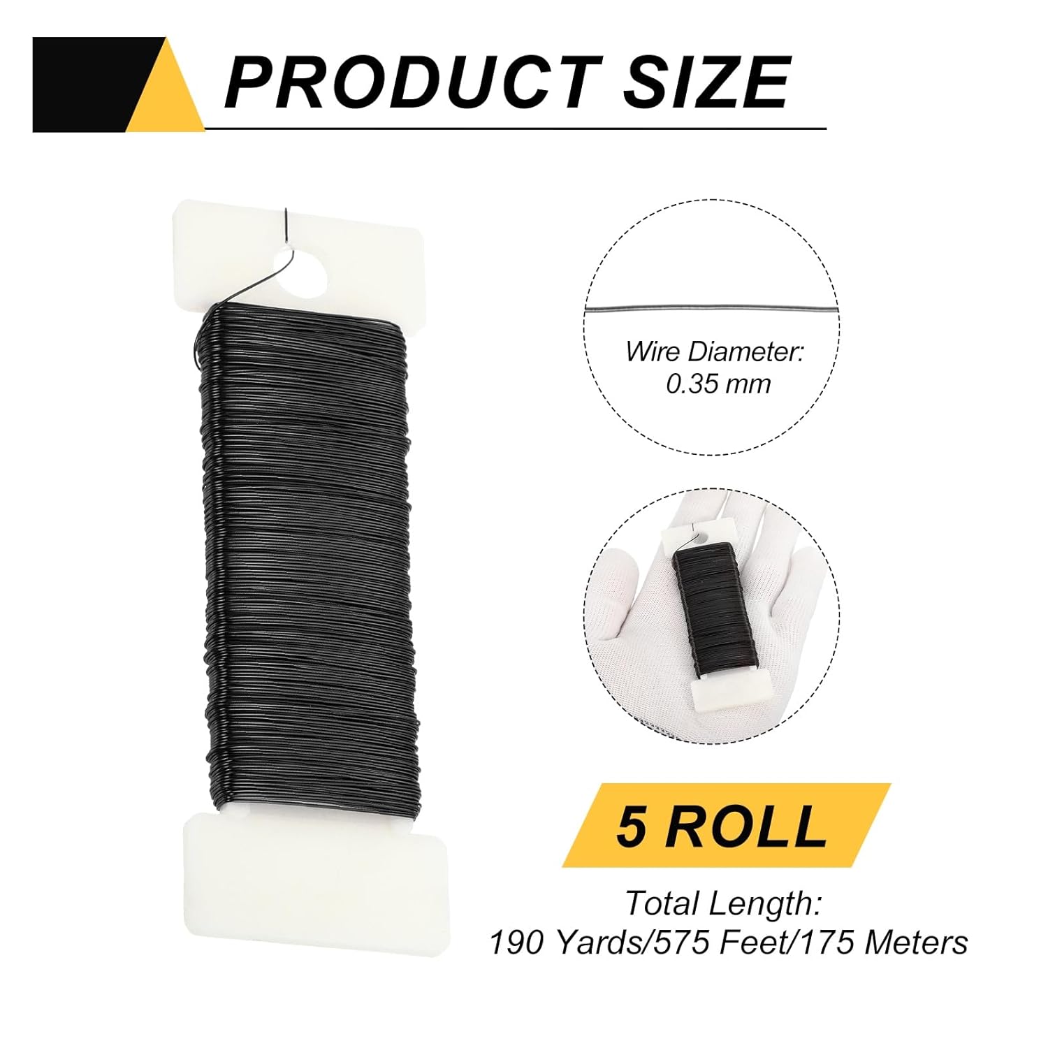 - Color: Black; Material: Aluminum; Total Length: 190 Yards/575 Feet/175 Meters; Diameter: 0.35mm/27 Gauge; In the package of: 5 Roll Metal Floral Wire (38 Yards/ Roll)