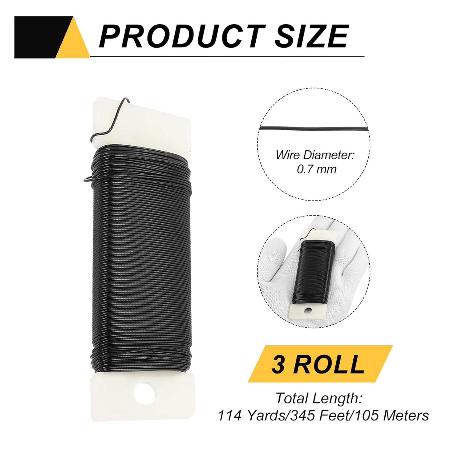 - Color: Black; Material: Aluminum; Total Length: 114 Yards/345 Feet/105 Meters; Diameter: 0.7mm/21 Gauge; In the package of: 3 Roll Metal Floral Wire (38 Yards/ Roll)