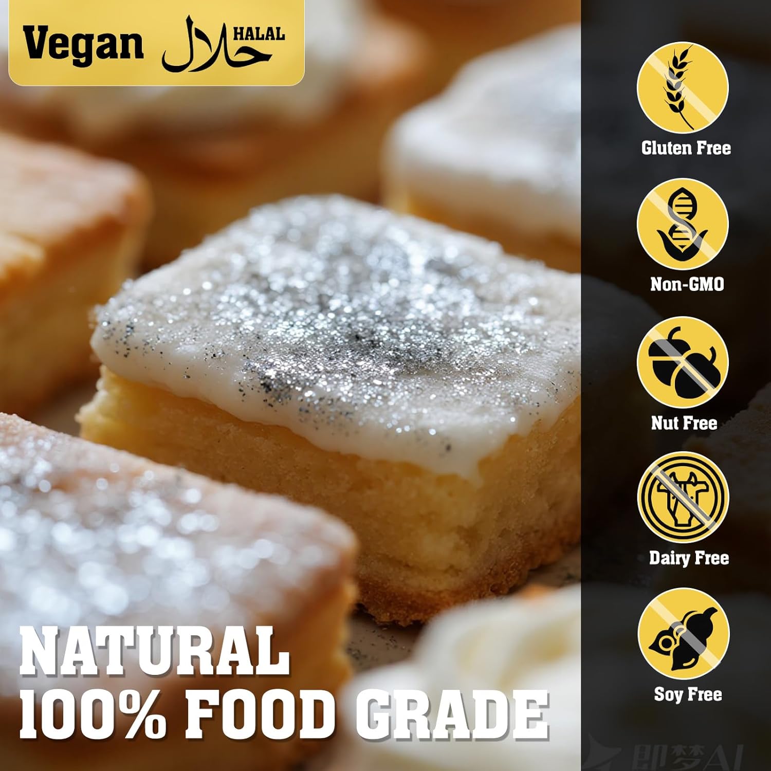 - 【Vibrant Colors & Party Favorite】: Our silver edible glitter delivers a dazzling metallic or pearl finish that instantly elevates desserts and beverages—from wedding cakes to lattes and holiday treats! Ultra-fine powder blends smoothly for a pro-level shimmer without clumping, perfect for bakers styling glitter cupcakes, Starbucks-inspired drinks, cocktail rimming, or DIY desserts.