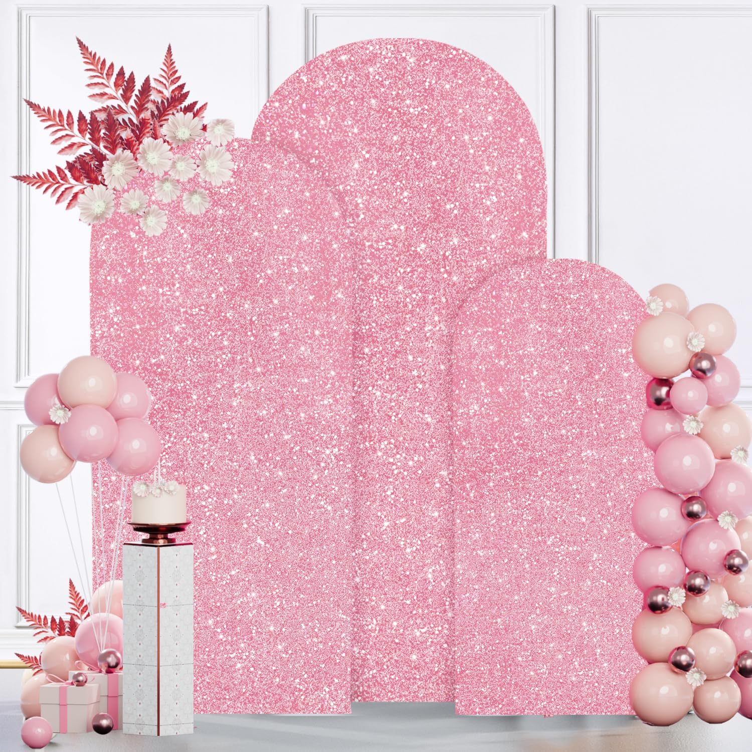 MODFUNS Metal Arch Backdrop Stand and Cover Set 4&5&6ft Pink Gold Sequins Arch Backdrop Cover Double Sided Arch Frame with Covers Gold Arch Stand and Covers for Banquet Reception Birthday Decor