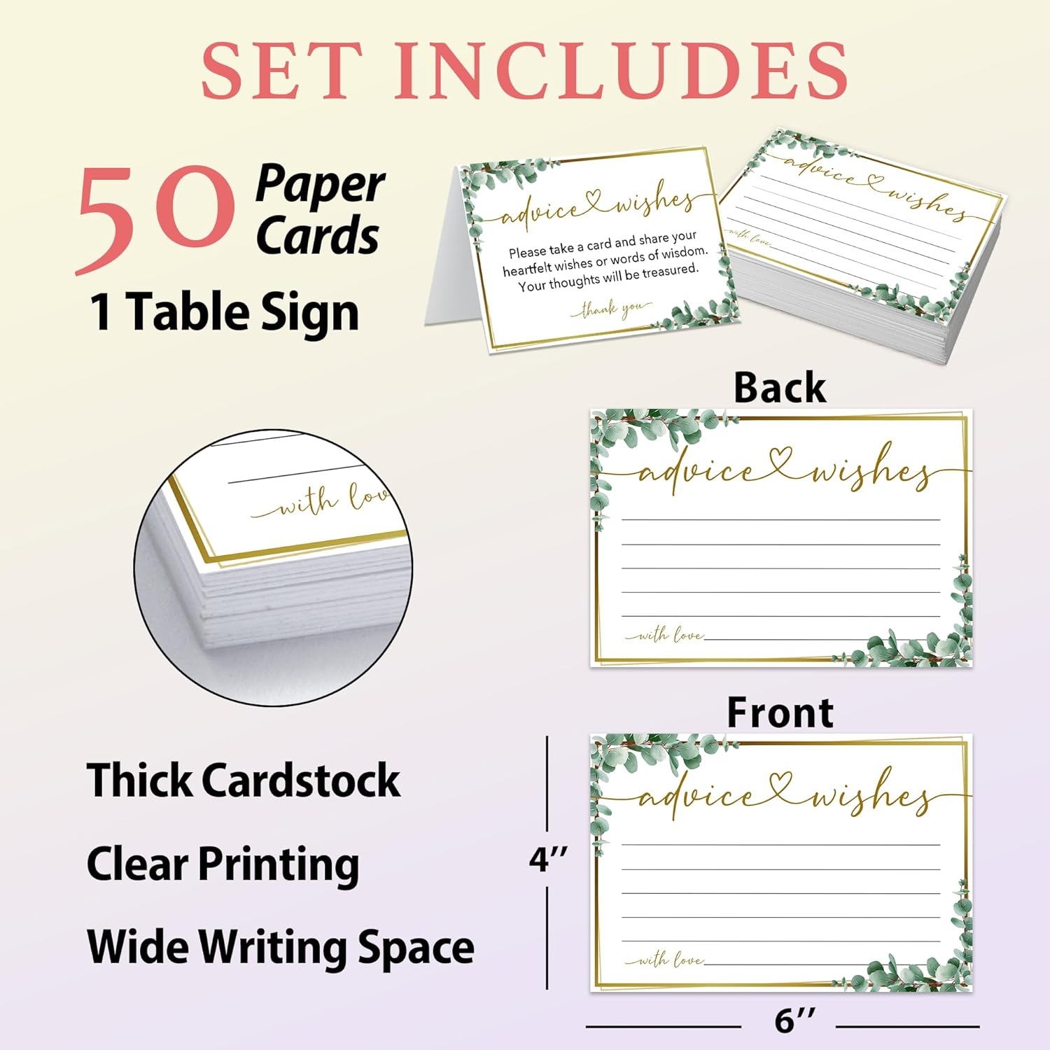 50 Advice and Wishes Cards, Double Sided Fill-In Advice Cards For Bridal, Wedding, Graduate Party, Mr & Mrs, Retirement, Baby Shower, Party Favor & Supplies, 4x6 inches Eucalyptus -A06