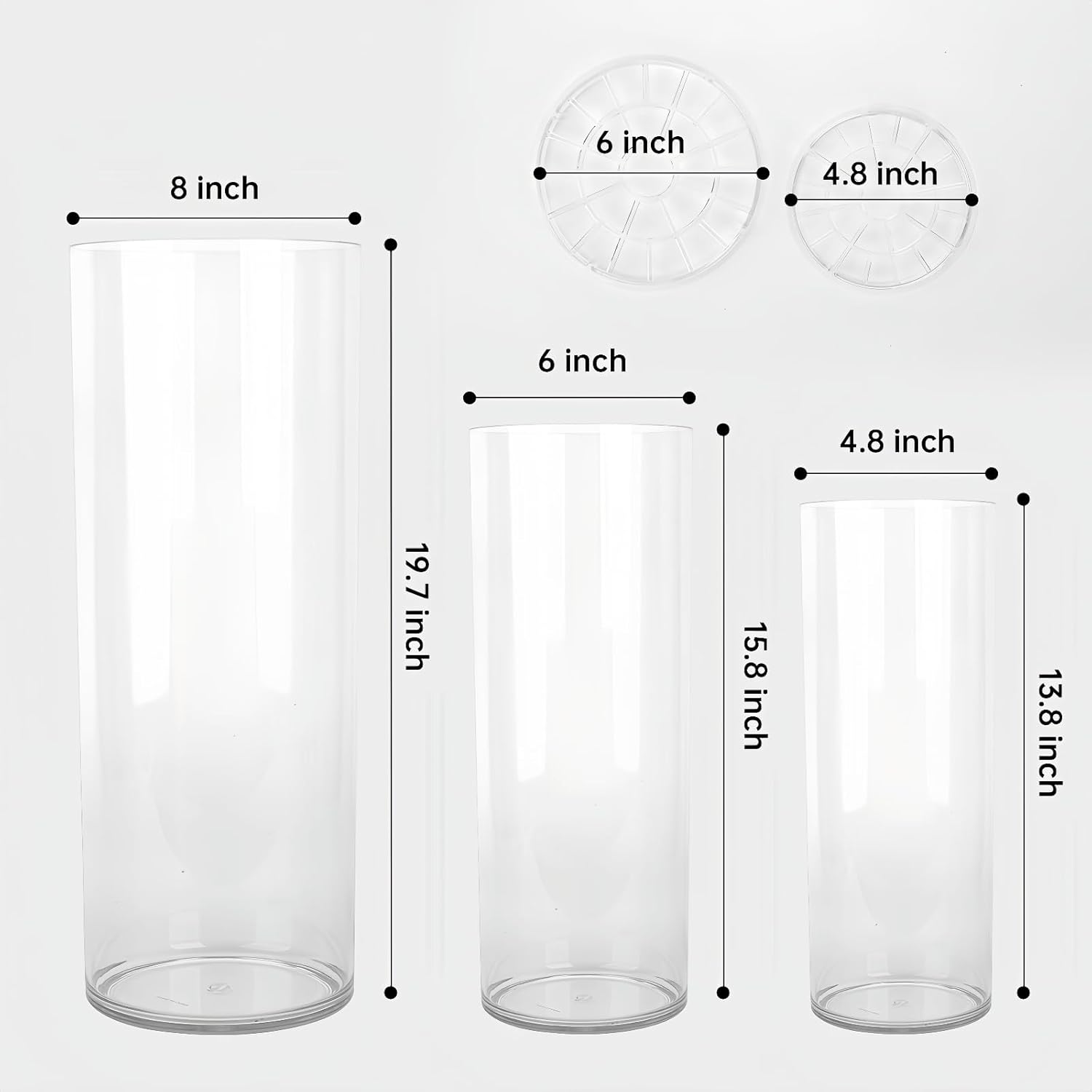 - 🌷【Packing List】3 transparent cylindrical vases, extra large: D 8" x H 19.7" 1, large: D 6" x H 15.8" 1, medium: D 4.8" x H 13.8" 1, Besides, there are 2 flower stands.