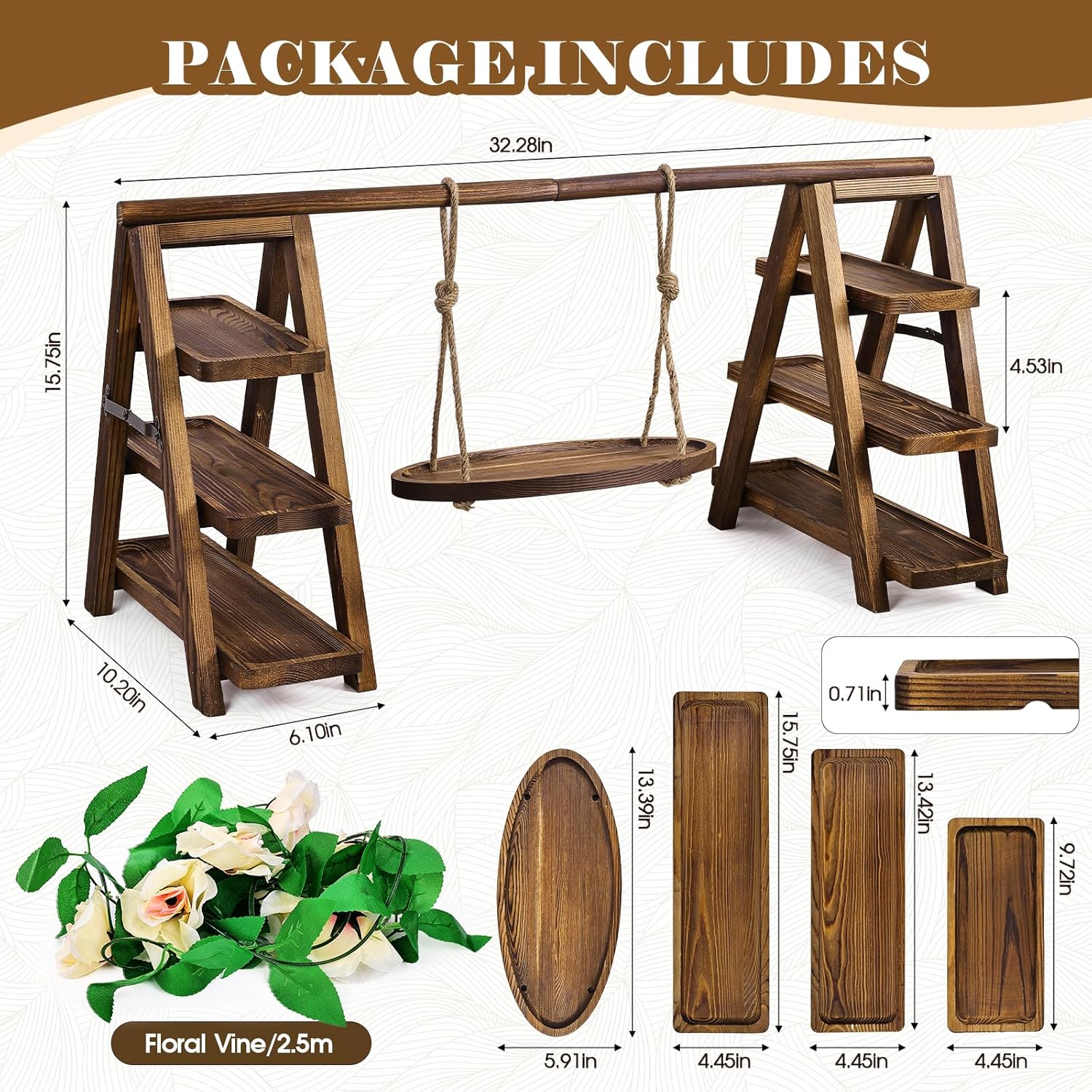 - Elegant Rustic Wooden Cupcake Stand:This 3 tierd serving tray ladder stand features a charming swing and decorative flower accents that add a touch of whimsy. With multiple tiers and the spacious serving platters, it effortlessly showcases cupcakes, fruits, snacks, cheese, donuts,and more.The combination of its Unique appearance and functional design makes it an ideal centerpiece for any celebration or home decor