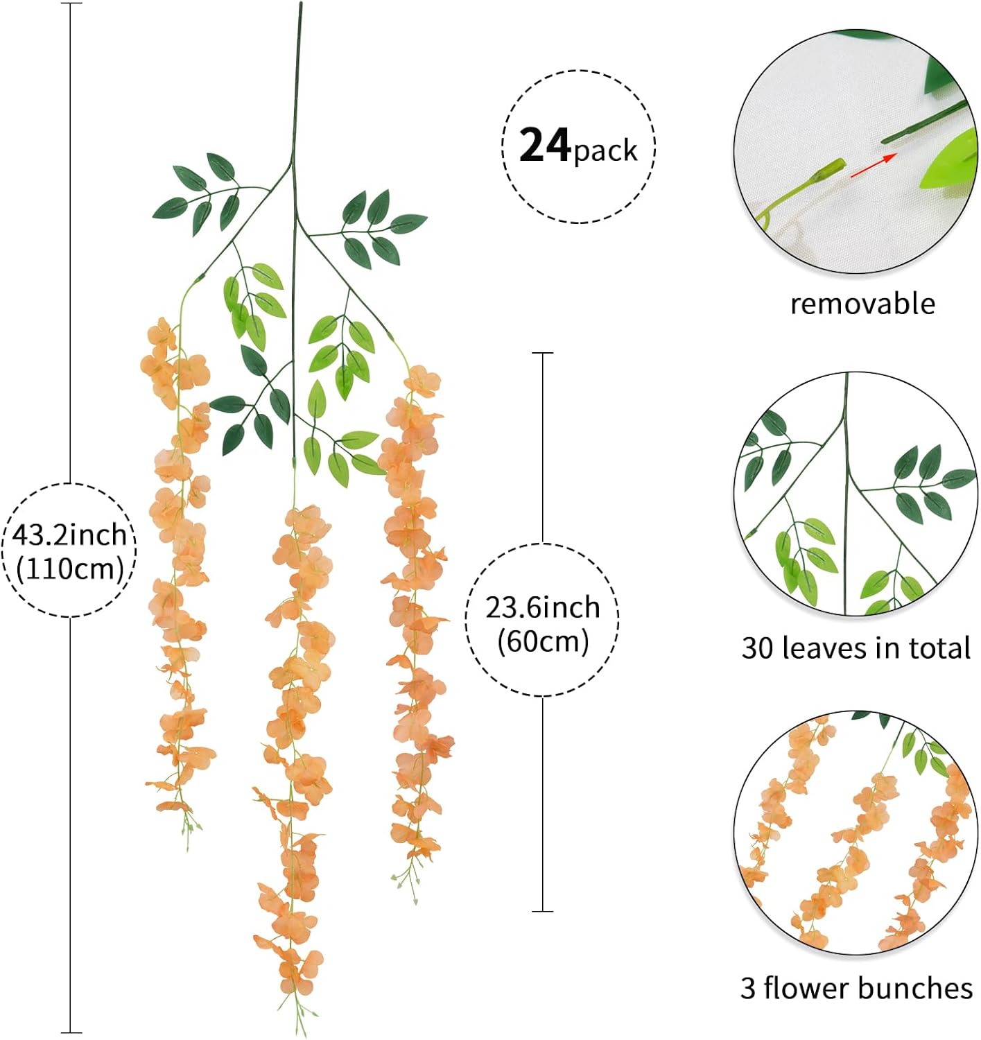 - 🌼Package Content - 24 x Artificial Wisteria Flowers, Orange petal. Size of each artificial flower vine is approx 43.2"/3.6 feet in length per wisteria with 3 branches flower string, each string is 23.62" in length with more flowers, looks full and beautiful.