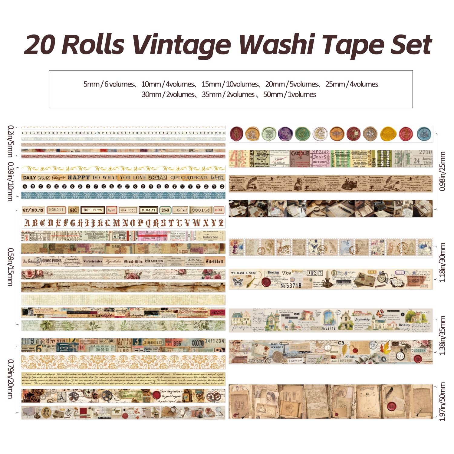 - 20 Rolls Washi Tape,2.36 inch(60mm) wide x 2 tapes;1.18 inch (30mm) wide x 3 tapes; 0.79 inch(20mm)wide x 3 tapes; 0.59 inch (15mm) wide x 6 tapes; 0.39 inch (10m) wide x 6 tapes;These different series and sufficient quantity washi paper stickers can meet your daily use and replacement.