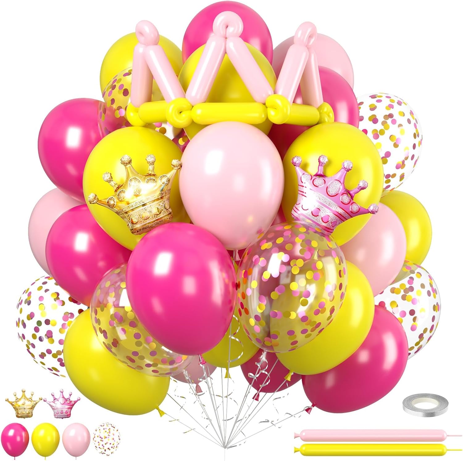 - Pink and Yellow Balloons Set: 44pcs 12-inch latex balloons (light pink, matte yellow, matte hot pink, pink gold confetti), 4pcs long balloons (yellow, pink), 2pcs crown foil balloons (pink, gold), 1pc silver ribbon in our party balloons set. From birthday to wedding, make your events unforgettable with our top-notch, reliable balloons that add a touch of elegance and fun.
