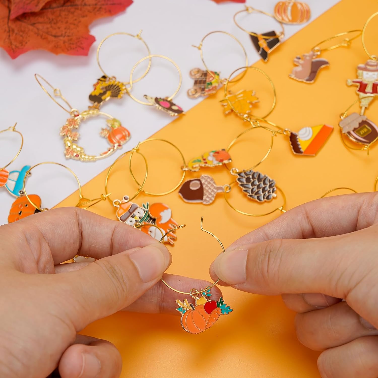 - Unique Design: These are autumn themed thanksgiving wine bottle decoration talismans with many autumn elements, featuring 30 very cute and interesting fall charms talismans. Each corn thanksgiving decoration charm is unique, including pumpkin, maple leaf, corn, squirrel, hedgehog, pine cone, mushroom, turkey, scarecrow, and wreath. Different shapes of wine charms for stem glassescan not only easily attract others' attention, but also decorate your wine glass well