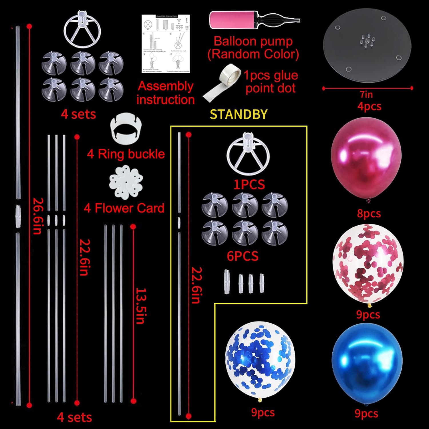 - Package Includes: The balloon arch kit includes 4 reusable balloon stands and 12 inch 32 pcs balloons(10 metallic blue balloons,10 metallic rose red balloons,6 pink confetti balloons and 6 blue confetti balloons),glue point dots,balloon pump,balloon clips,and tie tool.You don’t need to waste money to buy balloons
