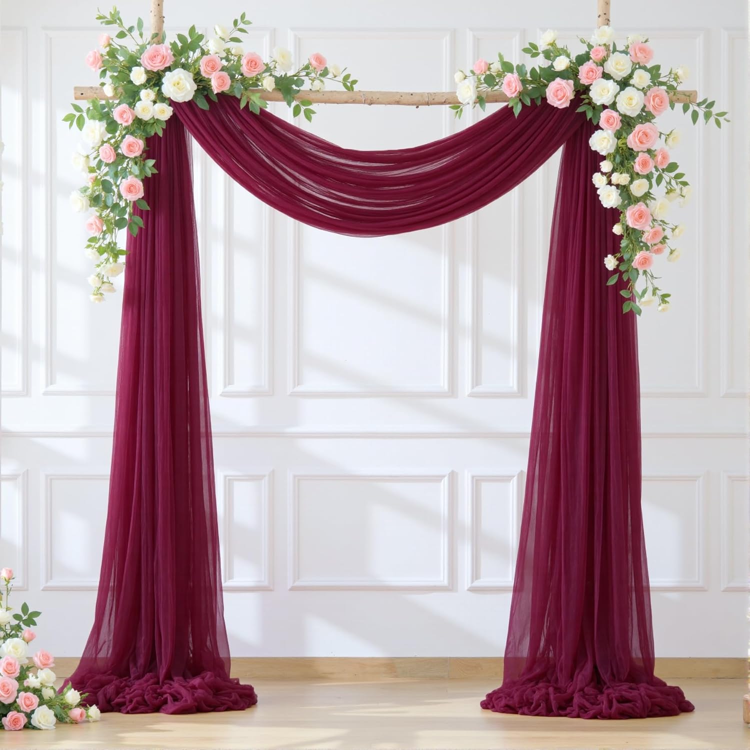 - Best Choice Wedding Arch: Package includes 1 panel burgundy wedding arch sheer drapes, each panel is 30 inches wide and 19 ft long. The drape of the fabric is perfect for use in a wedding arbor. These arch fabric add a pretty touch to pillars at a wedding.