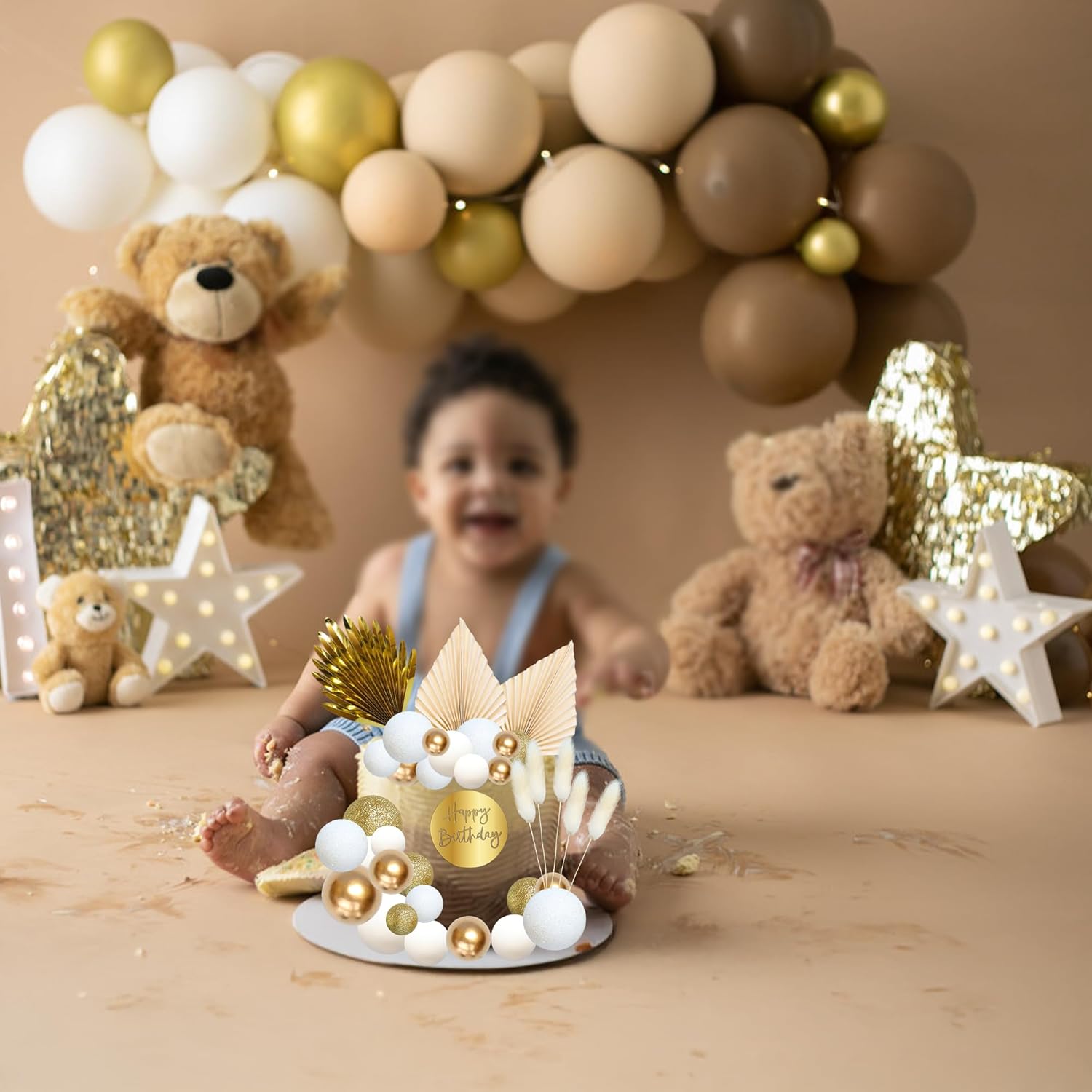 Ephlyn 33 Pack Balls Cake Toppers Boho Palm Leaves Cake Decorations Round Acrylic Happy Birthday Cupcake Toppers for Birthday Wedding Baby Shower Party Supplies Gold White