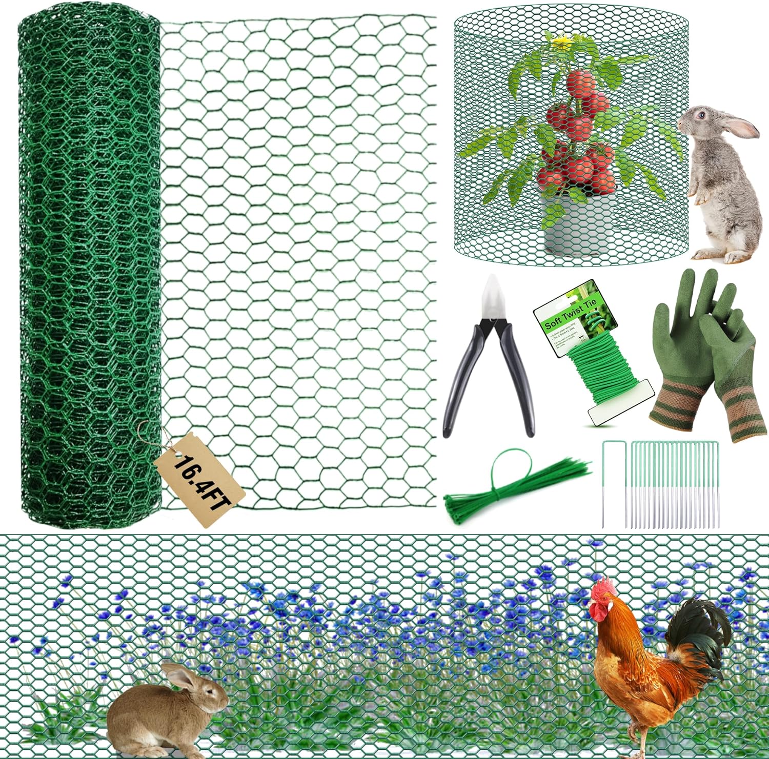 16.4Ft x16In Chicken Wire for Floral Arrangements - Free-Cut Green Metal Mesh with Hexagonal Galvanized PVC Coated Netting Guard Fence for Poultry, Garden, Plant