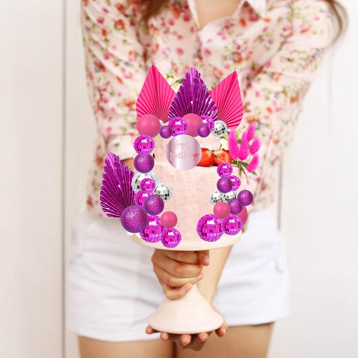 Ephlyn 33 Pack Balls Cake Toppers Boho Palm Leaves Cake Decorations Round Acrylic Happy Birthday Cupcake Toppers for Birthday Wedding Baby Shower Party Supplies Rose Red