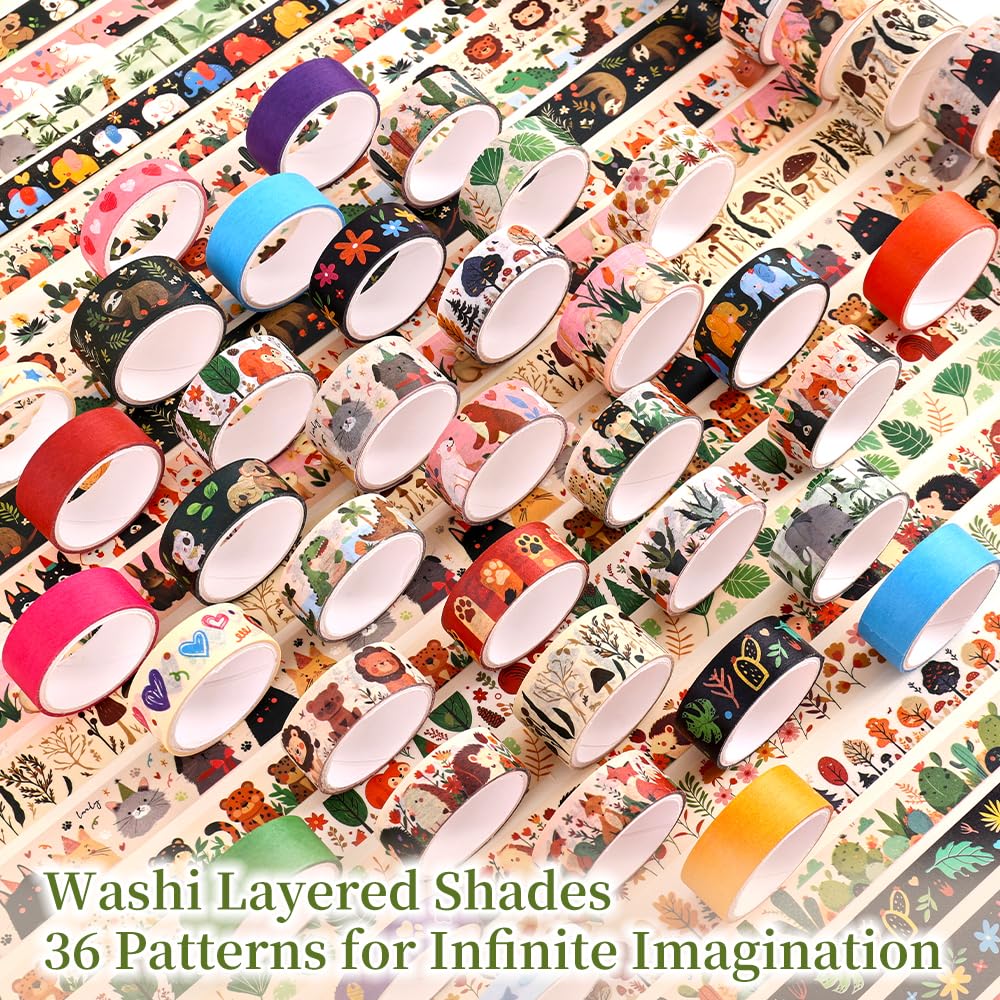 36 Rolls Animal Theme Washi Tape Set, Colorful Cute Adorable Animals Writable Decorative Tapes for Scrapbooking, Bible Journaling, Bullet Journaling, 0.6"x79" per Roll