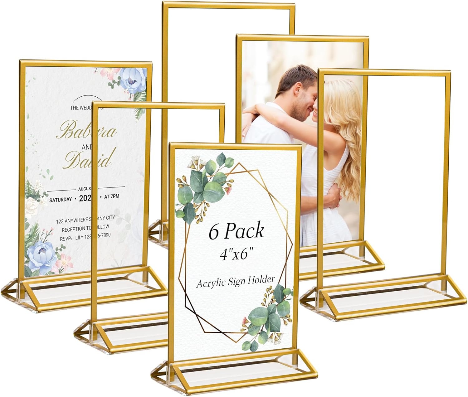 6 Pack Acrylic Sign Holder 4x6 Inches, Double-sided Picture Frames for Wedding Table Numbers Holders, Clear Menu Stand Table Top Display Sign Stand Flyer Holder Vertical Paper Holder,Gold Frames