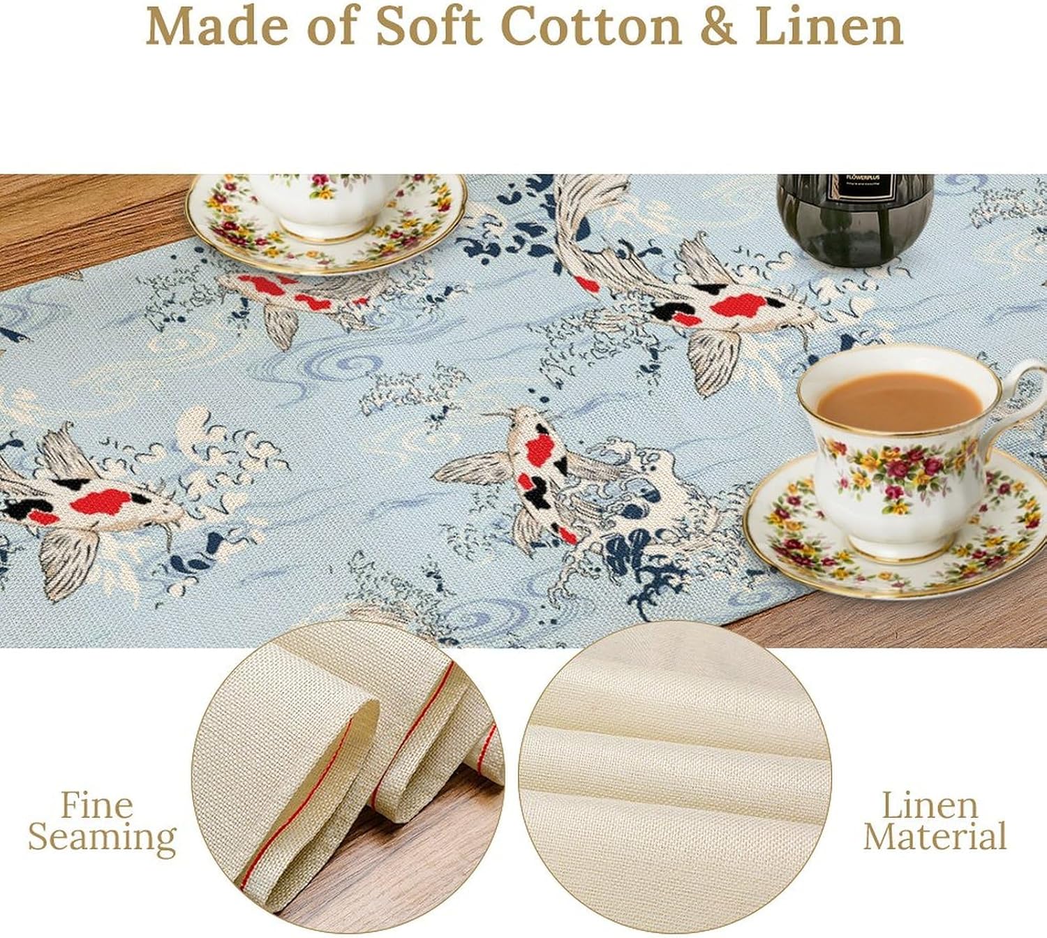 Kio Fish Table Runner Waves Retro Japanese Tradition Art Printed Burlap Runner Home Kitchen Dining Table Living Room Decor Fabric 1 Panel W13xL90in