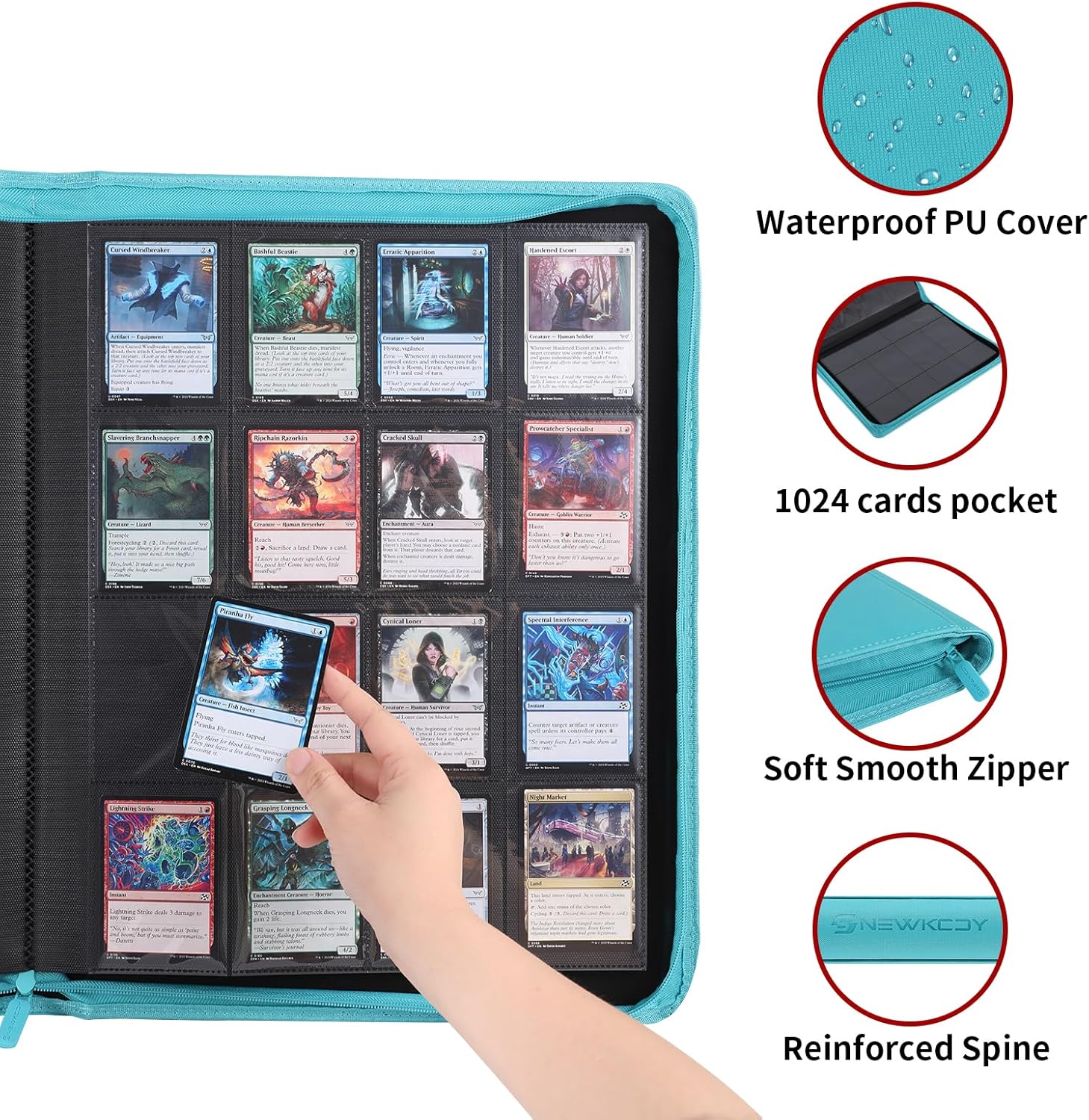 Snekdy premium 1024-pocket trading card binder, 16-pocket cards album, waterproof PU-leather Cover album with side loading, holds gaming, baseball, basketball & sports cards Turquoise