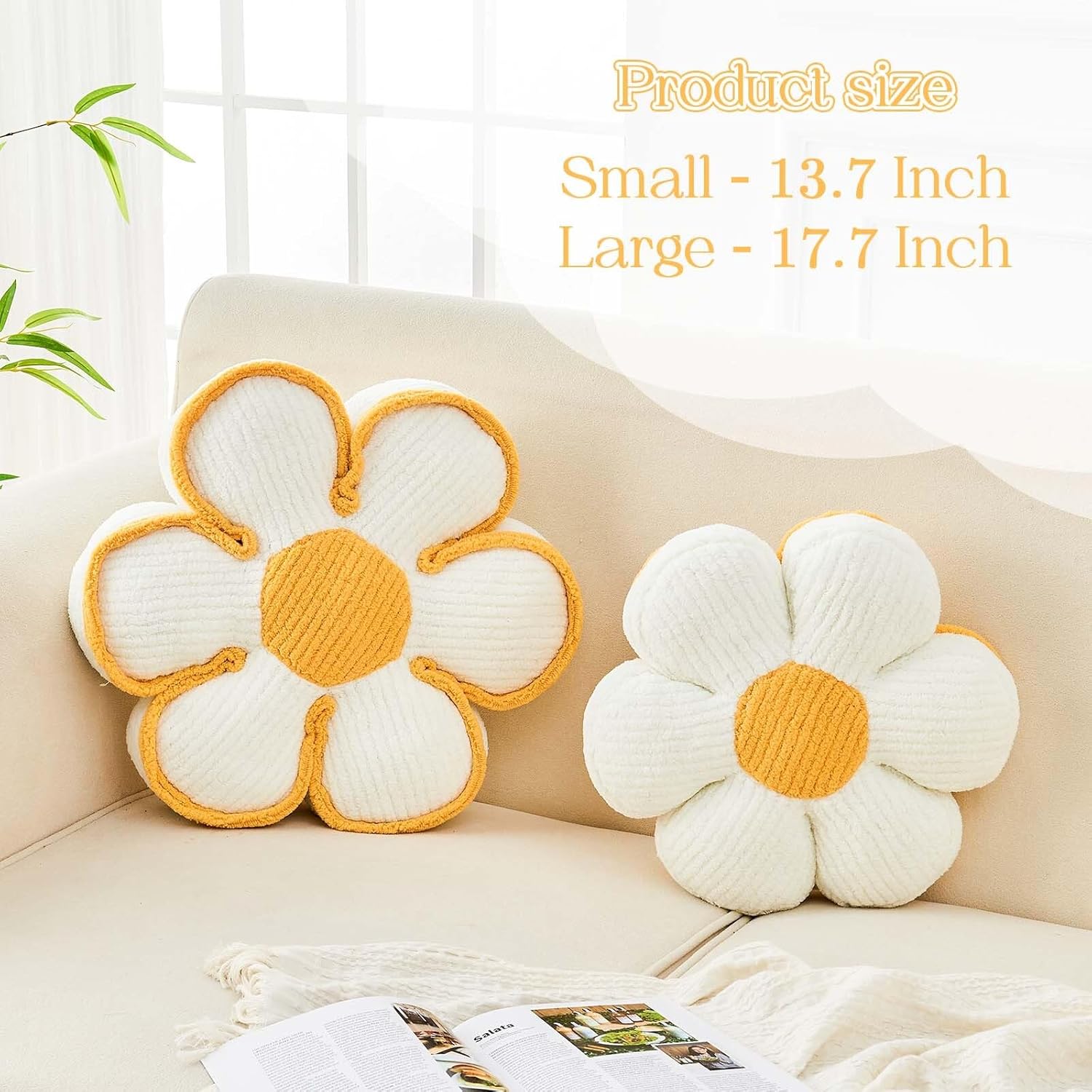 - DECORATIVE FLOWER PILLOWS OF VARIOUS SIZES - This floral throw pillow is not only a practical choice, but also a decorative addition to your living space. Small size - 13.7 Inch with 3 inch thickness, Large size - 17.7 inch with 4 inch thickness, whether placed on the floor, sofa or bed, it can effortlessly enhance the overall beauty of the room, adding cuteness and vitality to your bedroom decor a feeling of.