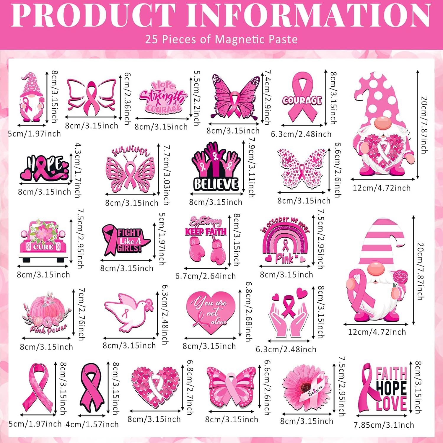 - Breast Cancer Awareness Decoration: a total of 25 pieces of lovely refrigerator magnet stickers, with pink as the theme, build a warm atmosphere; Our breast cancer awareness car magnets are with all kinds of essential classic elements of breast cancer awareness, such as pink ribbon, pumpkin, butterfly, love heart, dove of peace, flowers, faith, hope, love, so that you can express your care for breast cancer patients