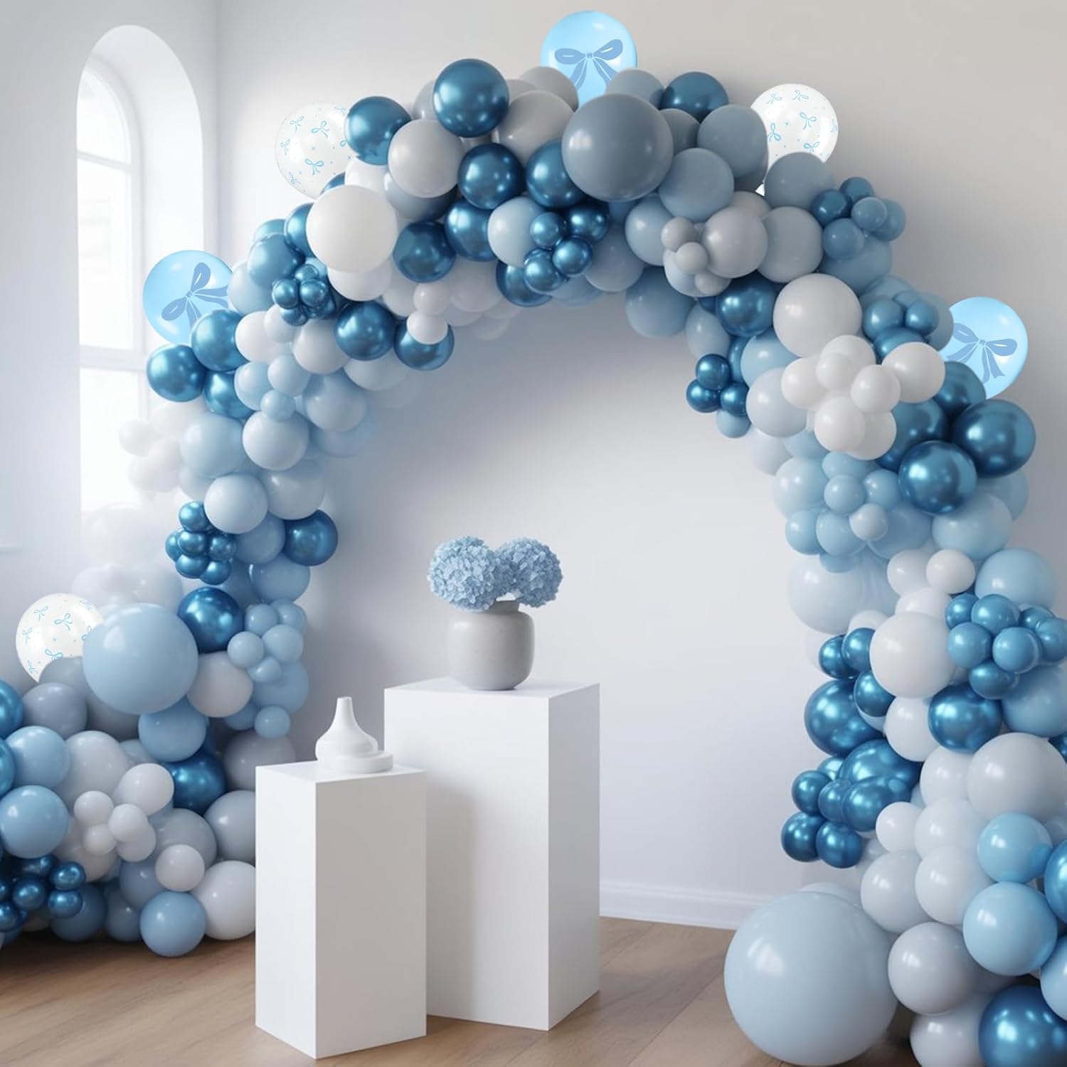 - All-in-One Set: This pastel blue bow balloons kit includes 30pcs 12inch latex balloons(pearl white, metallic blue, macaron blue), 10pcs blue silver confetti balloons, 20pcs bow print balloons(big bow print, small bow print), and 1pc silver ribbon. Whether it’s a birthday bash or bridal shower, the thoughtful color combo, suitable for adding a fun, modern touch to any celebration.