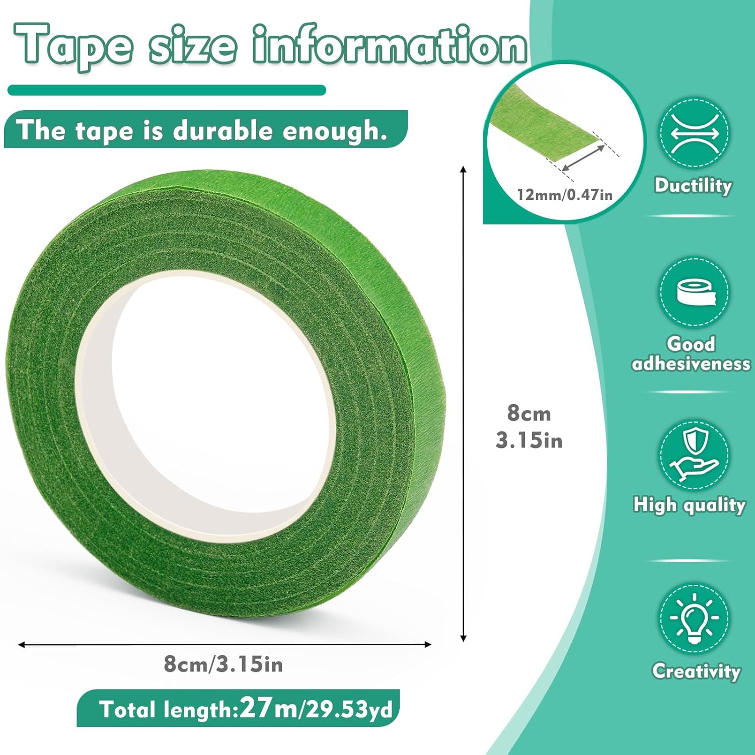 - Floral Tape for Bouquets: Dimensions: each roll is 0.47 inch (1.2)CM in width and 30 yards(27M) in length. Strong and Stretchable, it tears easily, lightweight, and flexible to use