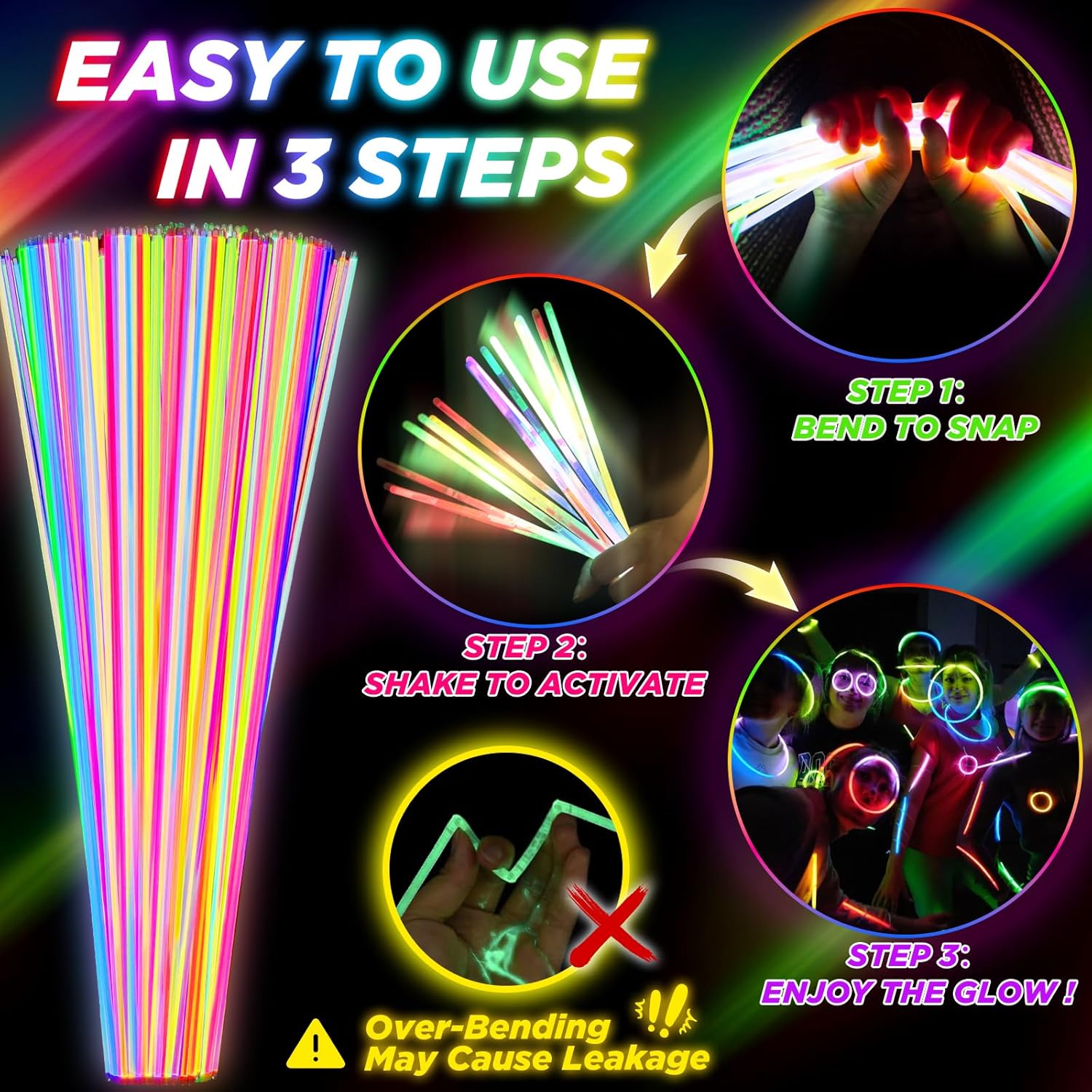 - 【BRIGHT & LONG-LASTING GLOW STICKS】: Designed to shine for over 9 hours, our 100Pcs 22 inch glow sticks deliver bold, vivid colors in 8 dazzling shades: red, orange, yellow, green, blue, purple, white, and pink. Just bend, snap, and shake—then let the glowing fun begin! DO NOT over-bend or fold repeatedly, as this may cause leakage.