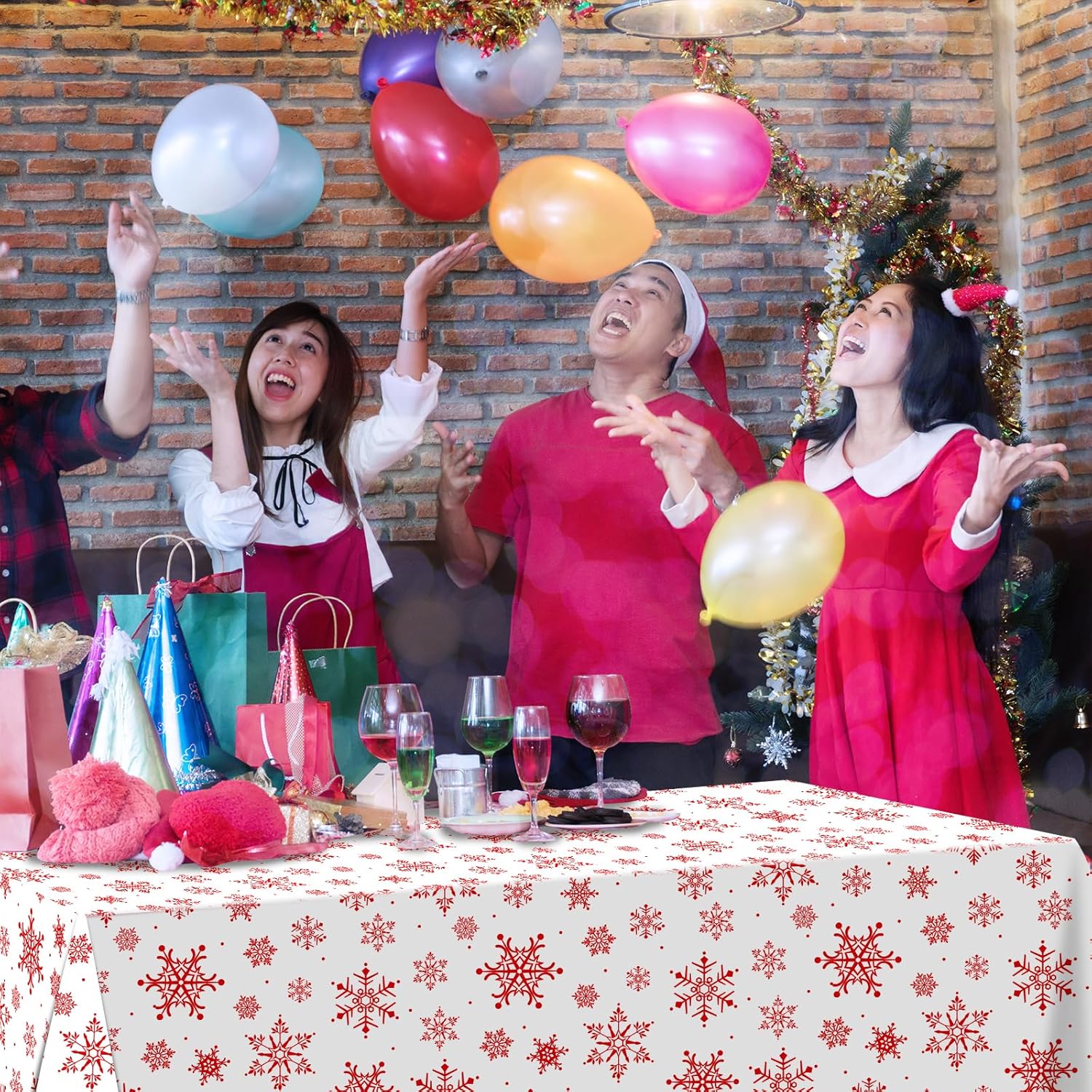 - Extra large size: these red white snowflake Christmas party tablecloth measures approx. 54 x 108 inches/ 137 x 274 cm, suitable for 8 feet long tables,which could accommodate for 8-10 people, It’s large enough for your to hold a winter holiday and Christmas theme party with your family and friends to share happiness